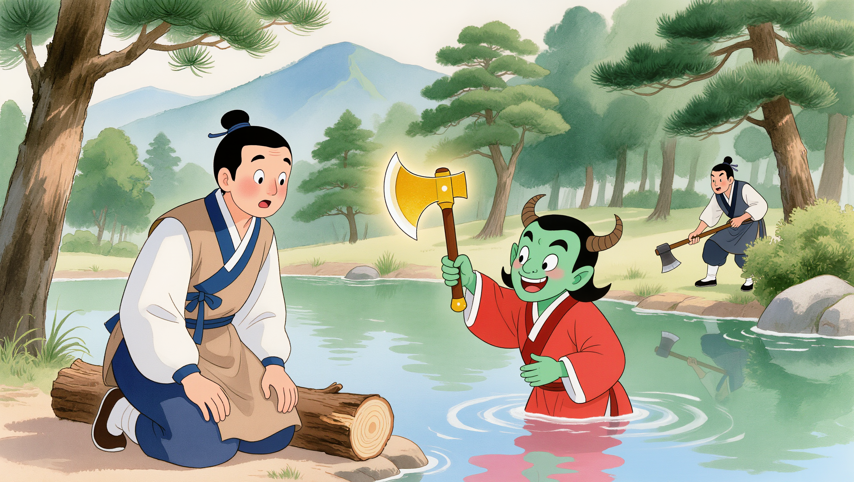 잠시 후, 다시 물이 부글거리기 시작했습니다. 도깨비가 나타났습니다. 이번에는 손에 무언가를 들고 있었습니다. 김 나무꾼은 눈을 크게 떴습니다. 도깨비가 들고 있는 것은 황금빛으로 빛나는 도끼였습니다!