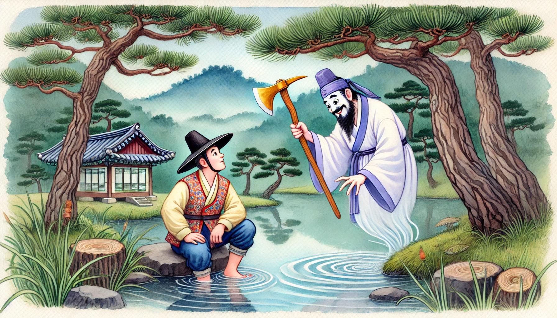 김 나무꾼은 연못가에 앉아 물을 바라보았습니다. 맑고 깨끗한 물이었습니다. 그는 품에서 낡은 쇠도끼를 꺼냈습니다. 여전히 간직하고 있던 그 도끼였습니다.