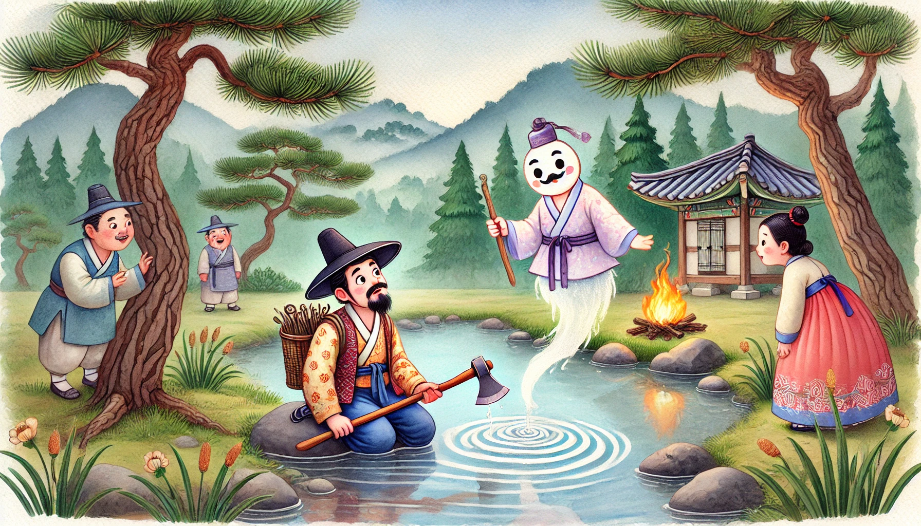 "여보, 그 도깨비 연못이 정확히 어디였소?" 아내가 물었습니다. "산 중턱에 있는 맑은 연못이오. 거기서 도끼를 떨어뜨렸더니 도깨비가 나타났지요."