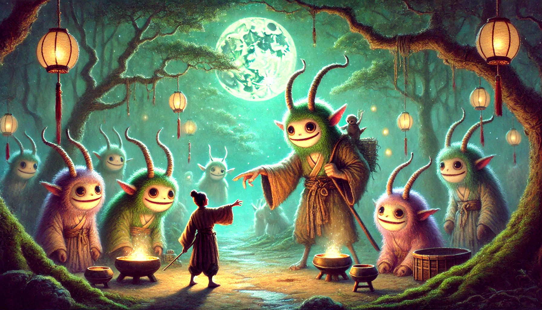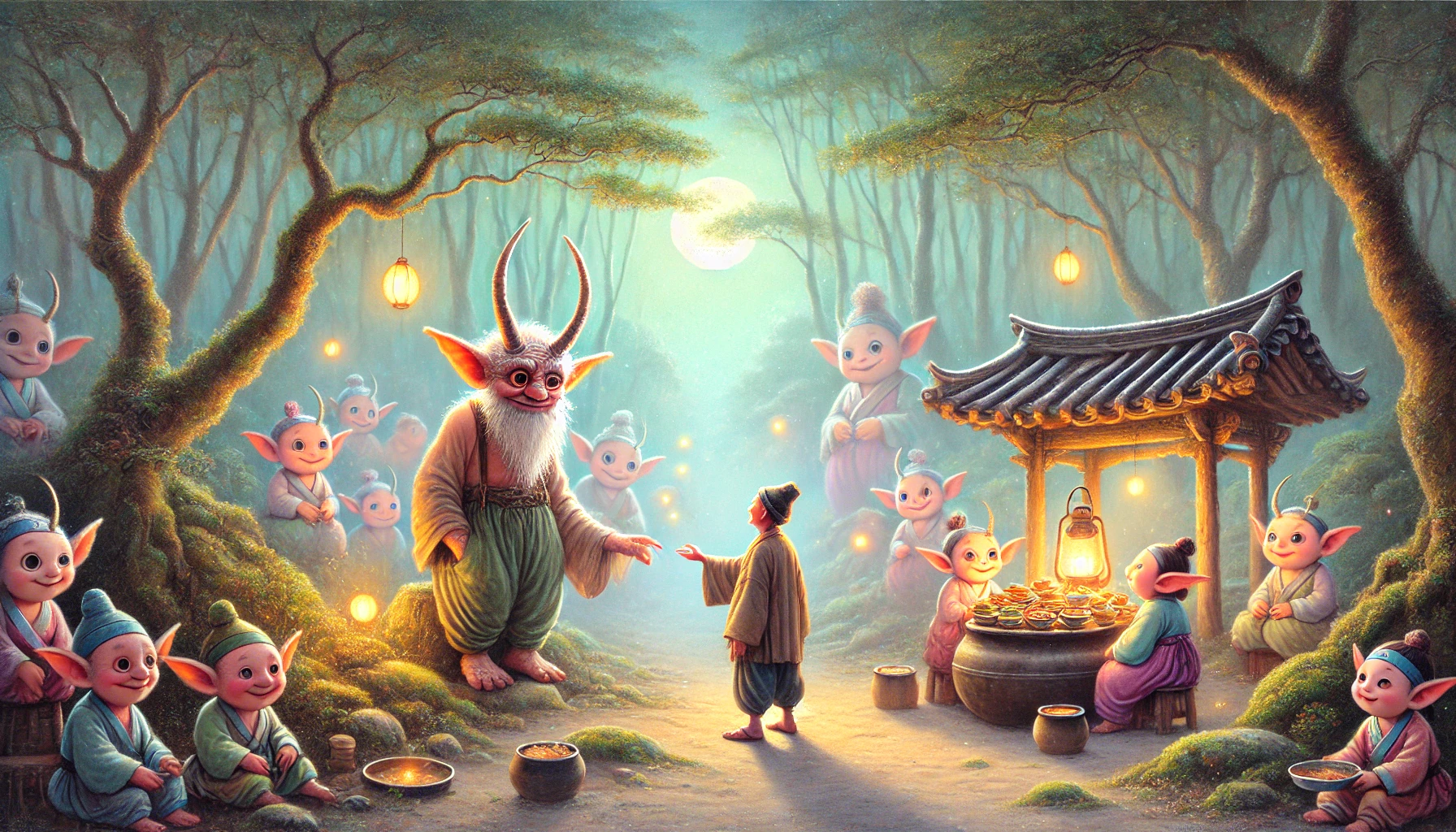 넓은 공터에 수십 명의 도깨비들이 모여 잔치를 벌이고 있었습니다. 키 큰 도깨비, 뚱뚱한 도깨비, 홀쭉한 도깨비, 온갖 생김새의 도깨비들이 손에 손에 방망이를 들고 춤을 추고 있었습니다. 그들의 피부는 푸르스름하게 빛났고, 머리에는 뿔이 돋아 있었습니다. 공터 한가운데에는 커다란 모닥불이 타오르고 있었고, 그 주위로 갖가지 음식이 가득 차려져 있었습니다. 떡, 과일, 고기, 술, 세상의 모든 진귀한 음식들이 산더미처럼 쌓여 있었습니다.