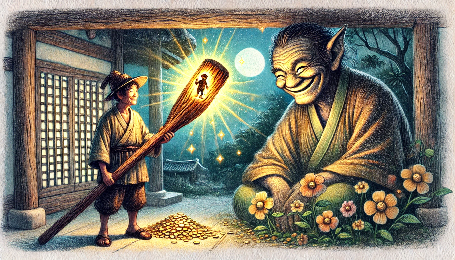 "자네에게 은혜를 갚고 싶소. 내가 가진 것 중에 가장 소중한 것을 주겠어." 깨동이는 자신의 품에서 작고 오래된 나무 방망이를 꺼냈다. 그 방망이는 별로 특별해 보이지 않았다. 그냥 평범한 나무 막대기 같았다.