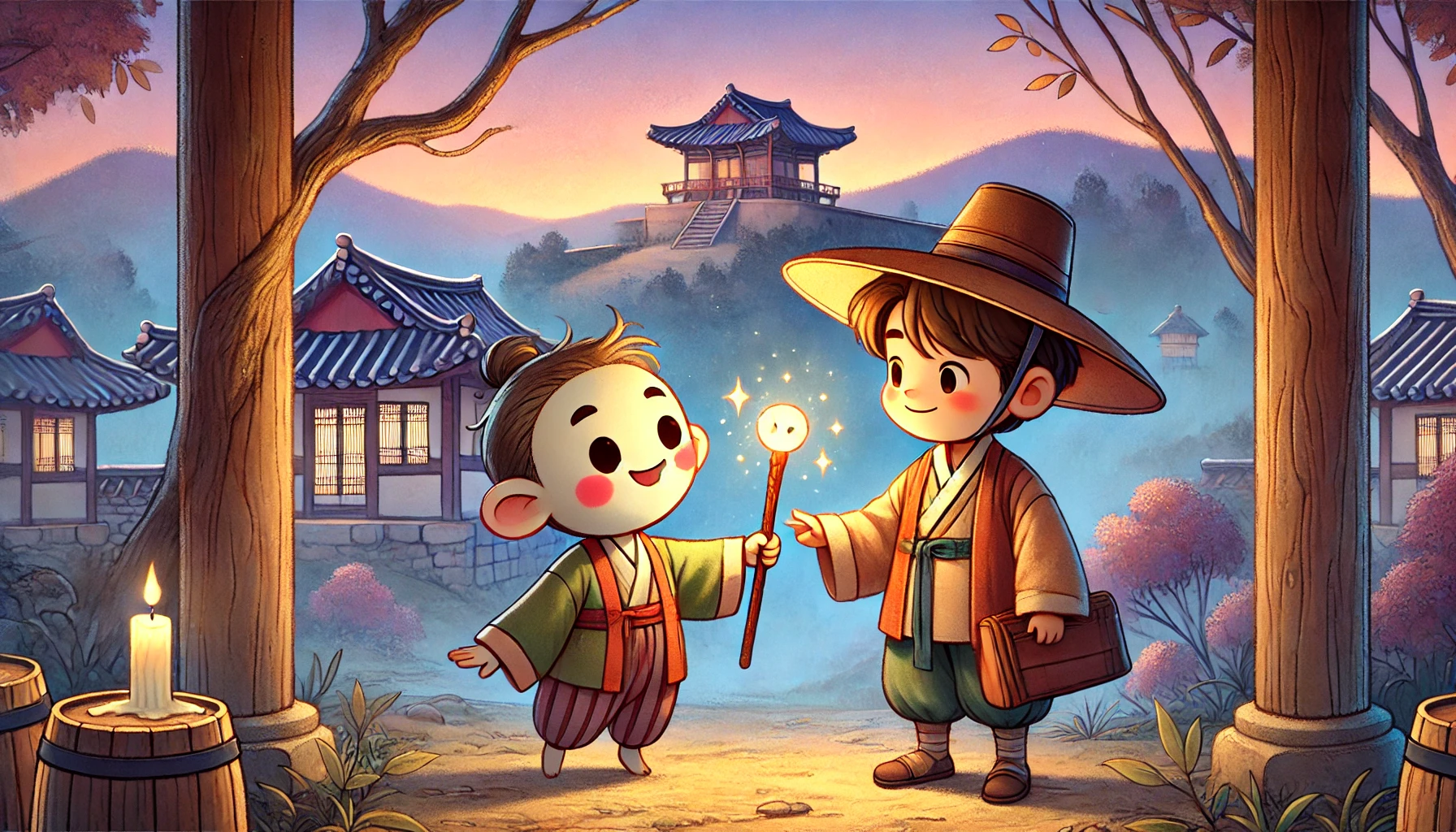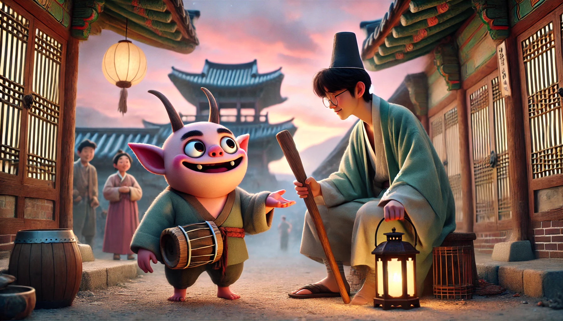 "누, 누구세요?" 복동의 목소리가 떨렸습니다. 그림자가 천천히 다가왔습니다. 달빛이 그의 얼굴을 비추자, 복동은 그것이 무엇인지 알 수 있었습니다. 빨간 얼굴에 작은 뿔이 달린, 영락없는 도깨비였습니다! 하지만 이상하게도 그 도깨비는 무섭게 생기지 않았습니다. 오히려 장난스럽고 익살스러운 표정을 짓고 있었습니다.