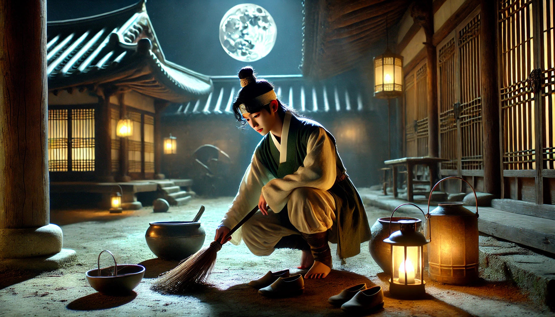조심스럽게 수연의 집에 다가간 홍달은 모두가 잠든 것을 확인한 후, 살며시 마당으로 들어섰습니다. 달빛 아래, 그는 마당 한구석에 세탁물이 가득 담긴 바구니를 발견했습니다.
