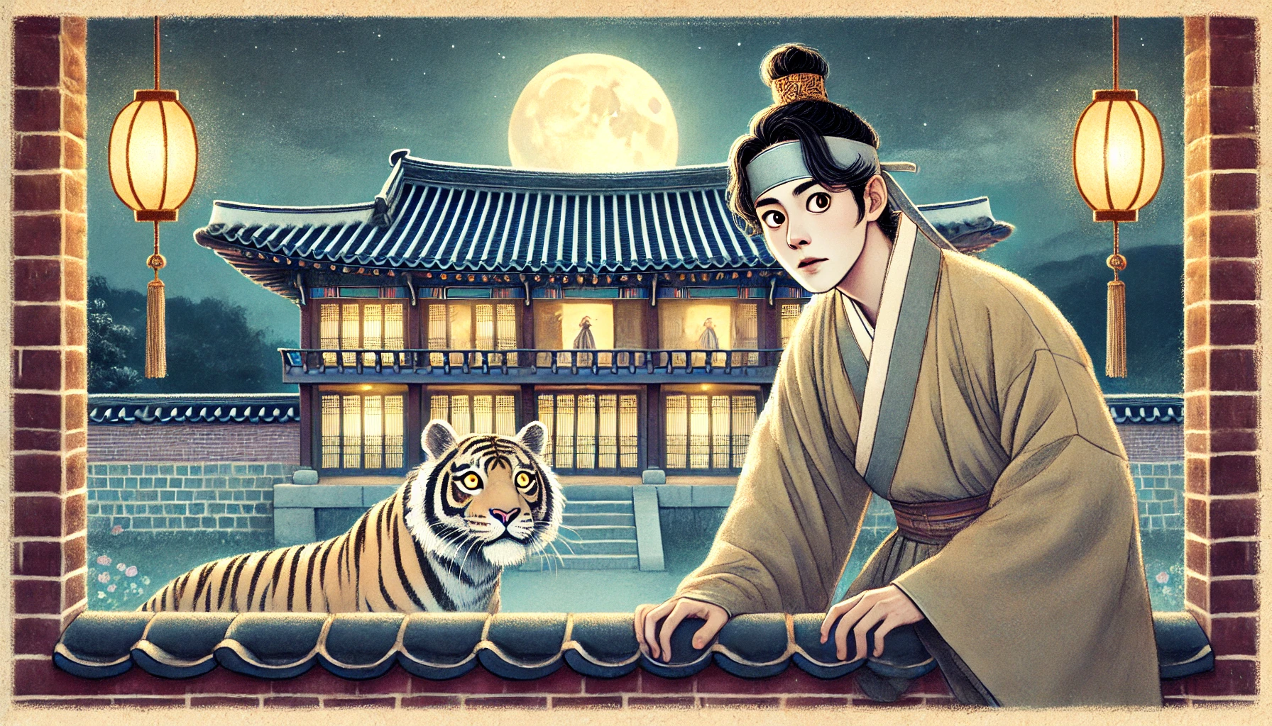 담장 위에 매달린 김 선비는 공포와 고통의 경계에서 처절하게 버티고 있었습니다. 호랑이는 여전히 담장 아래에서 그림자처럼 유유히 꼬리를 흔들고 있었는데, 녀석의 덩치는 어둠 속에서도 위압적이었고, 선비는 그 짐승의 습기 가득한 숨소리와 짐승 특유의 짙은 체취를 코로 맡을 수 있었습니다. 선비는 '이제 죽었구나, 옥 과부의 그림자 한번 보려다 호랑이 뱃속에 들어가겠구나' 하며 온갖 후회와 절망에 사로잡혔지만, 그 후회조차도 생존 본능 앞에서는 무의미했습니다. 그는 움직일 수도, 소리를 크게 낼 수도 없었습니다. 담장 안쪽에서는 옥 과부의 방에서 새어 나오는 은은한 등잔불만이 유일한 희망의 빛이었고, 담장 바깥은 호랑이의 날카로운 숨소리와 정적만이 감돌고 있었습니다.