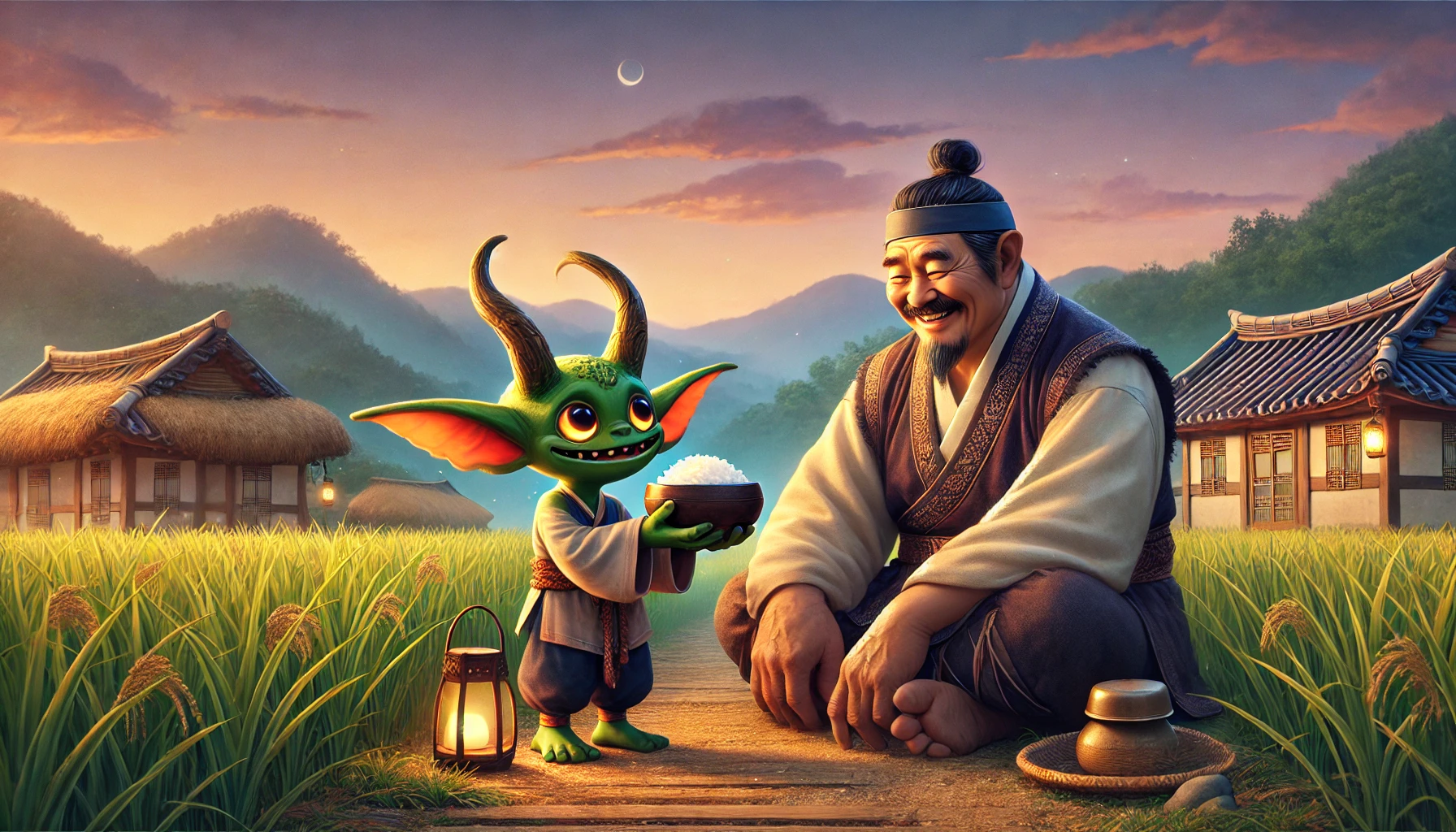그날 밤, 김씨와 도깨비는 논두렁에 나란히 앉아 이야기를 나누기 시작했습니다. 별들이 총총 떠오르고, 가을바람이 살랑살랑 불어오는 고요한 밤이었어요.