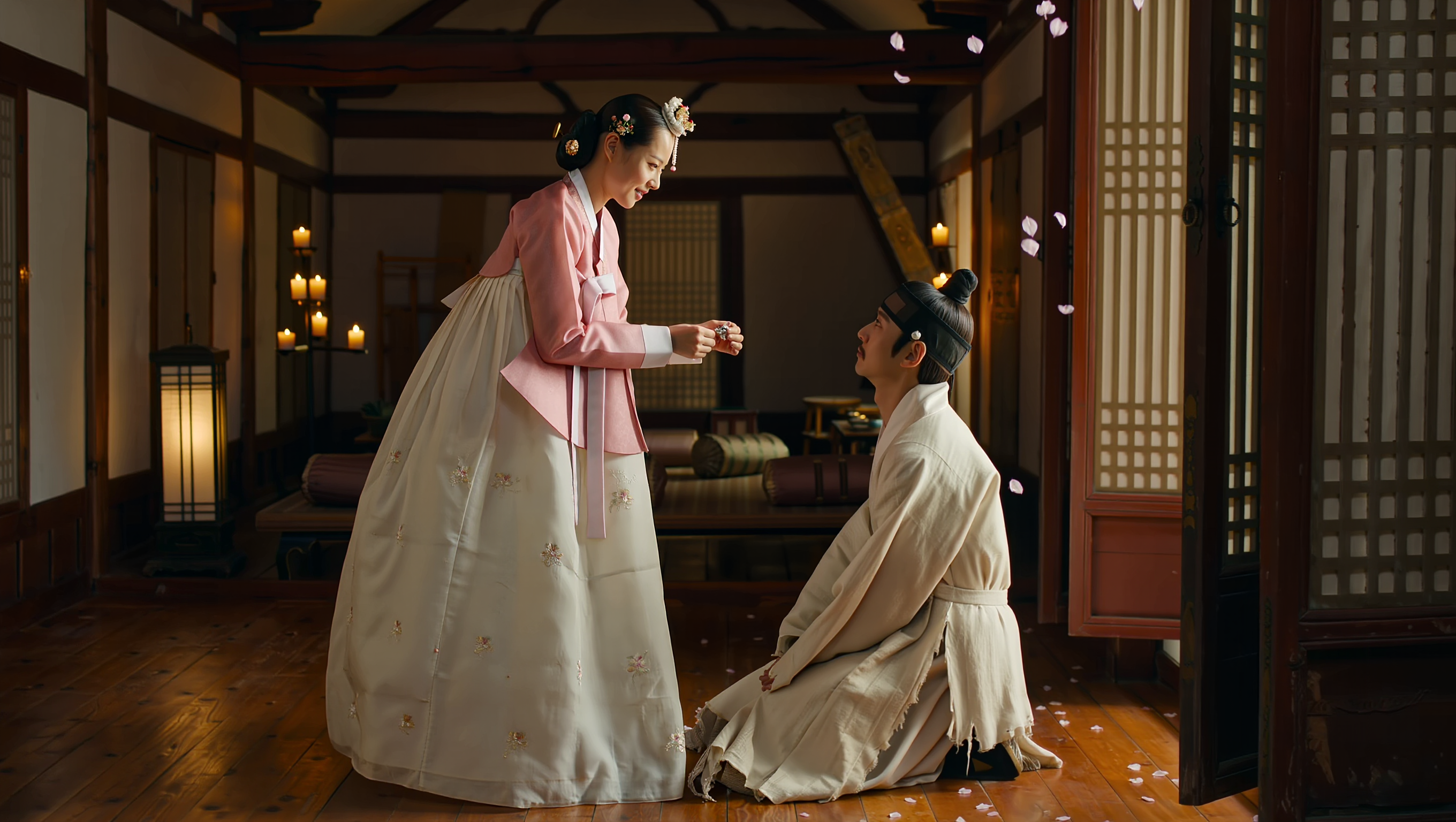 A cinematic scene set in Joseon Dynasty Korea — a beautiful young Korean gisaeng woman in elegant traditional hanbok holds a broken silver hairpin in her delicate hands, offering it to a poor but dignified young scholar in a worn white dopo robe who kneels before her on the wooden maru floor of a traditional Korean hanok house. Warm candlelight illuminates their faces in the dimly lit room. Cherry blossom petals drift through an open wooden lattice window. The atmosphere is intimate, emotional, and deeply romantic. Traditional Korean interior with paper doors, wooden beams, and silk cushions. Photorealistic, cinematic lighting, warm tones, shallow depth of field, 16:9 aspect ratio, no text.