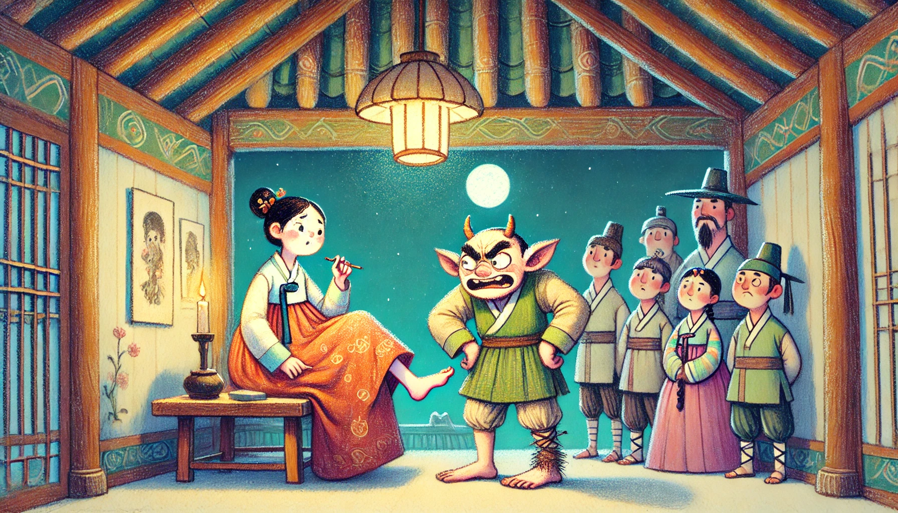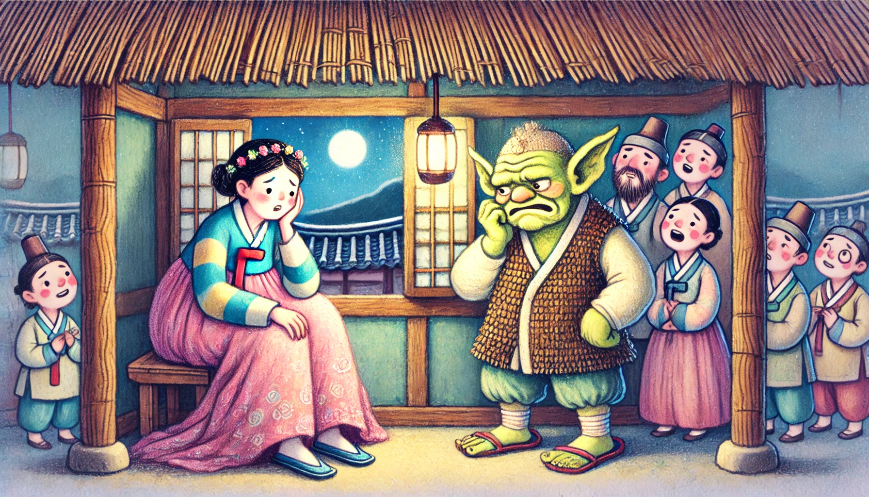 도깨비가 무릎을 탁 칩니다. "좋아! 내 오늘부로 네 소원을 들어주마. 내 이 신통방통한 능력으로 네 짝을 하나 데려다줄 테니, 그 대신 약속 하나 해라. 서방 생기면 다시는 밤에 곡소리 내지 않기로! 내 잠 좀 자자, 제발!"