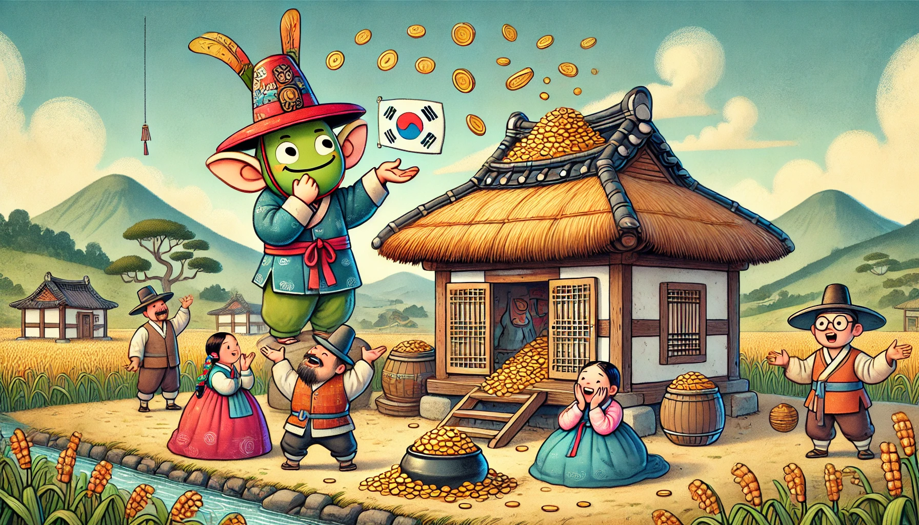 그런데 더 가관인 건 김진사가 하는 말이었어요. "최봉달, 네가 정말 정직하다면 그 황금 중에 절반을 나한테 줘야 해. 나는 마을의 어른이니까 당연히 받을 자격이 있어!"