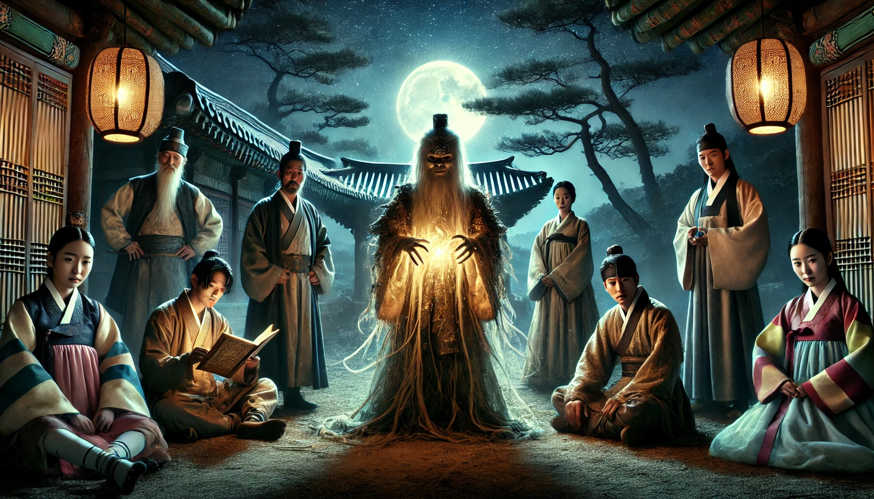 조선 후기, 한양 외곽의 조용한 산자락. 달빛이 밝게 비치는 밤, 작은 정자에 다섯 명의 도깨비가 모여 있었다. 청송, 용단, 월아, 건복, 그리고 천지. 그들은 오래된 친구처럼 편안한 분위기 속에서 이야기를 나누고 있었다.