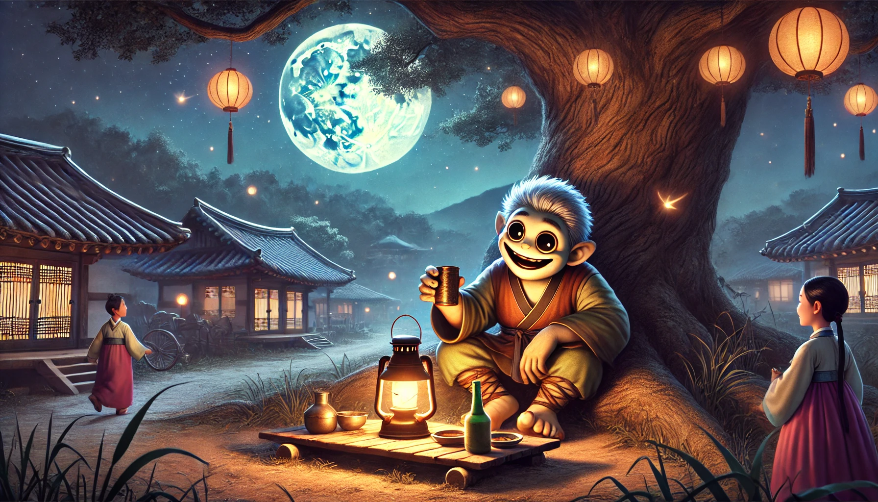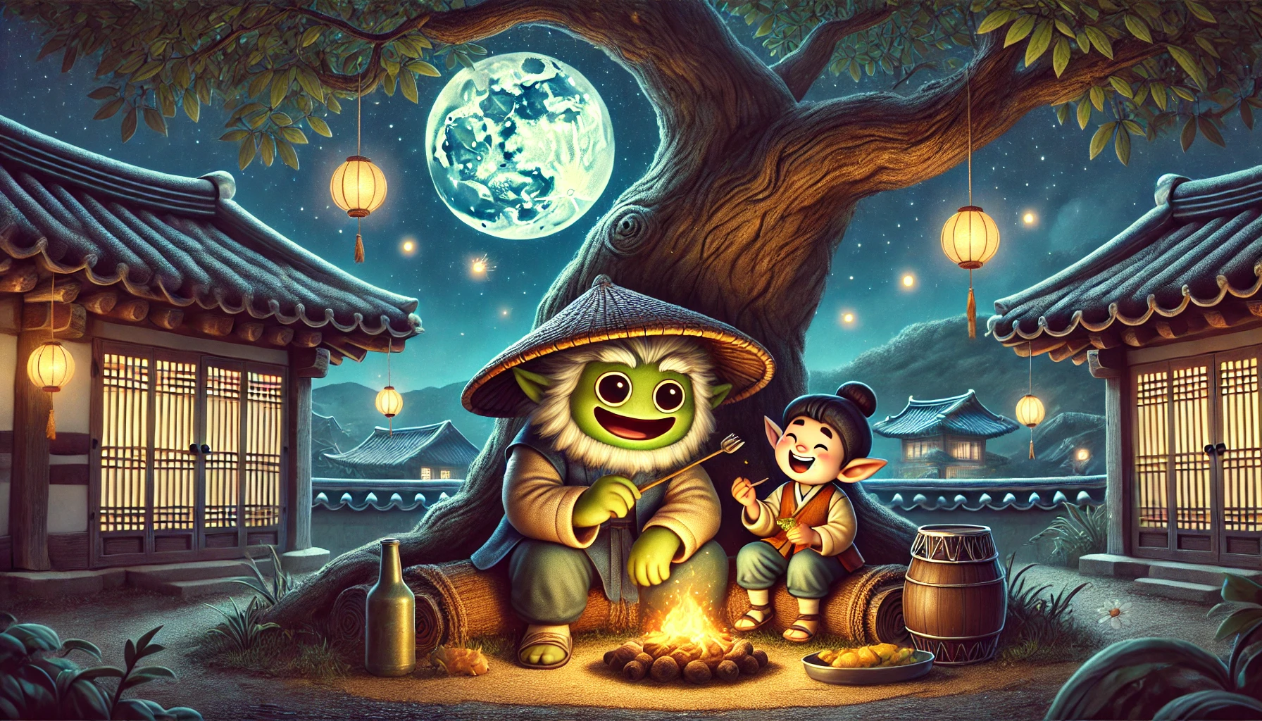 도깨비는 김이 모락모락 나는 음식을 한 입 베어 물며 만족스러운 표정을 짓고 있었다. 그의 앞에는 커다란 항아리가 있었고, 그 안에는 온갖 진귀한 음식이 가득 차 있었다.