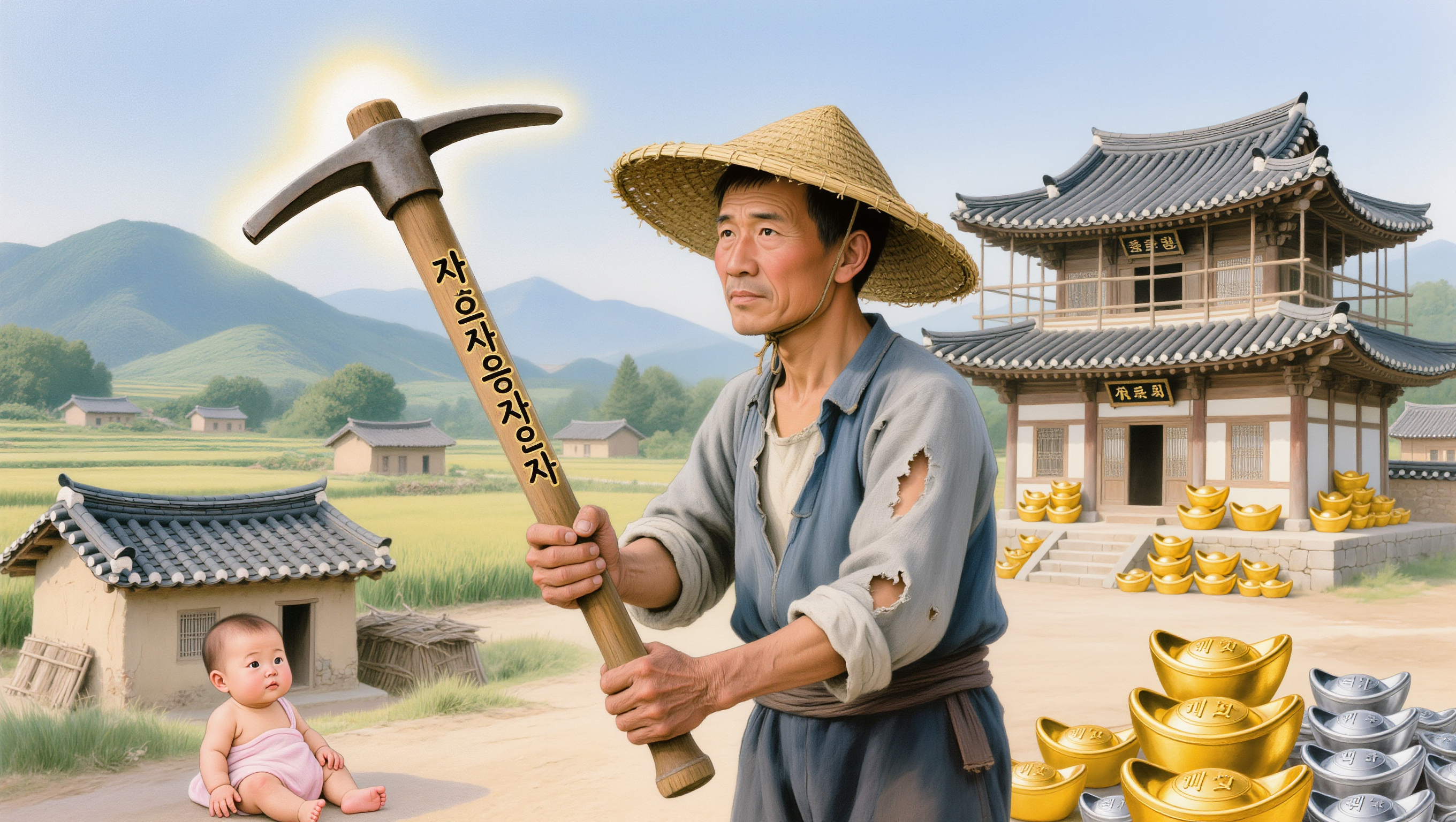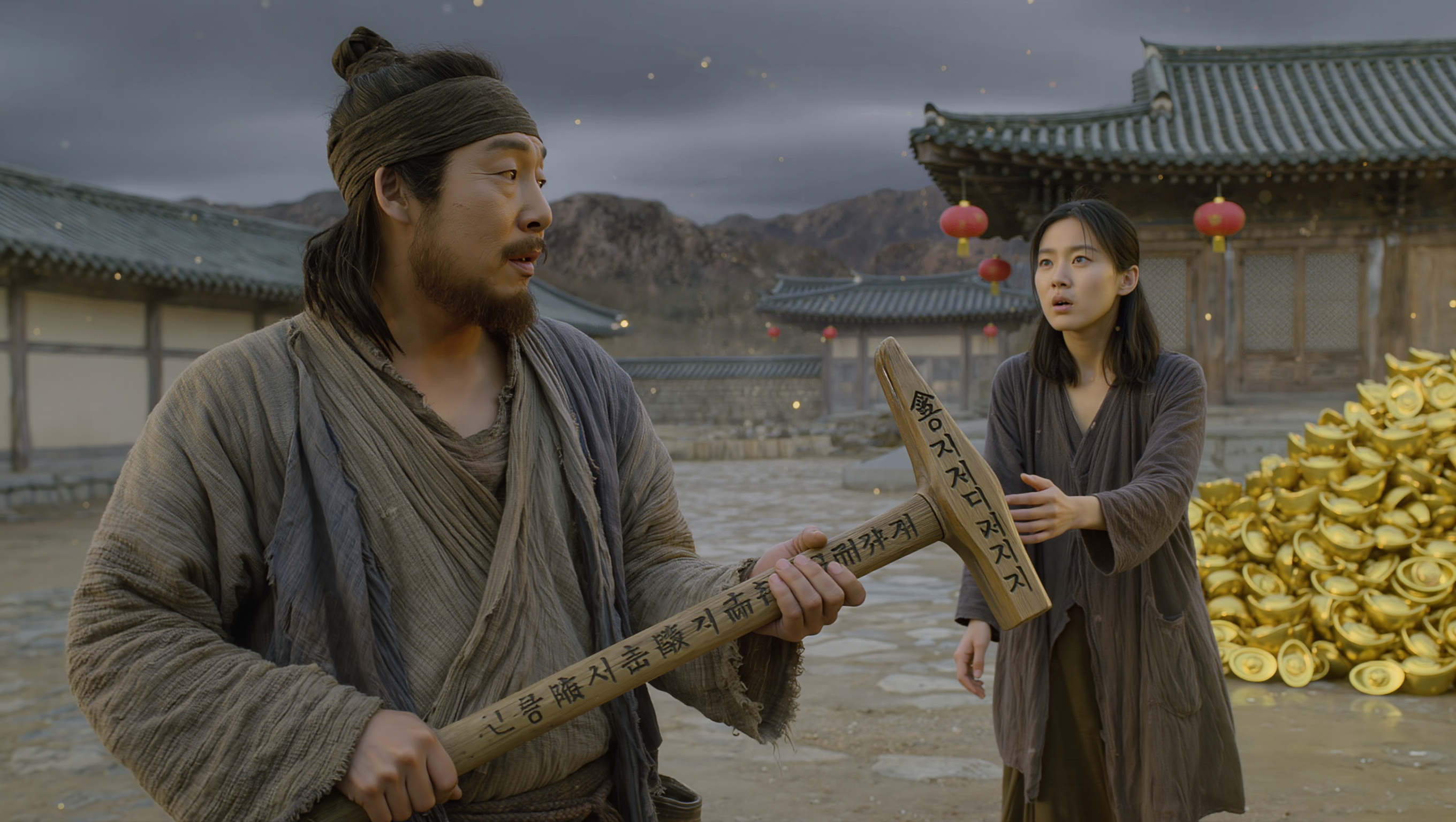 품에 방망이를 숨기고 산을 내려올 때 다리가 후들거렸다. 흥분인지 공포인지 분간이 되지 않았다. 집에 도착하니 새벽이었다. 마당 한구석에 쪼그려 앉아 방망이를 꺼내 들었다. 달빛 아래에서 보니 투박하고 울퉁불퉁한 나무토막에 불과했다. '이게 진짜일까. 산에서 본 게 꿈이었을까.' 미신이라고 치부하기에는 금덩이가 쏟아지던 광경이 너무도 선명했다. 방 안에서 순이의 기침 소리가 들려왔다. 콜록콜록, 가늘고 길게 이어지는 기침. 그리고 잠꼬대처럼 새어 나오는 가느다란 목소리. "여보... 배고파..." 만석의 심장이 쥐어짜이듯 아팠다. 아내가 잠결에도 배고프다고 했다. 저 안에서 젖도 부족한 아이가 앵앵거리고 있을 것이다. 이를 악물었다. '그래, 딱 한 번만이다. 쌀 한 가마니만 나오면 된다. 더도 말고 덜도 말고 딱 한 번만 쓰고 다시는 꺼내지 않겠다.' 마당 구석, 아무도 볼 수 없는 곳에서 방망이를 높이 들어 올렸다. 심장이 목구멍까지 치밀어 올랐다. 새벽바람이 차갑게 뺨을 스쳤고, 어디선가 부엉이 울음소리가 길게 울렸다. 방망이를 쥔 손에 힘을 주었다. "금 나와라 뚝딱!" 소리가 새벽 공기를 갈랐다. 순간 방망이에서 눈부신 빛이 터져 나오며 묵직한 울림이 땅바닥을 타고 발밑까지 전해졌다. 만석은 그 빛 속에서 눈을 질끈 감았다. 되돌릴 수 없는 첫 걸음을 내디딘 것이다. '이것이 축복인지 저주인지, 그때는 알 수 없었다.'