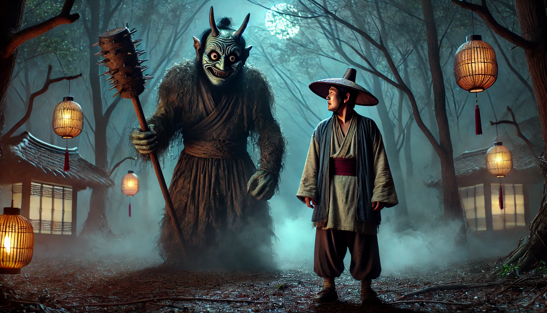 그때 파란 불빛 뒤에서 누군가 나타났습니다. 키는 사람만 하지만 머리는 대나무로 만든 바구니처럼 뾰족하고, 눈은 호롱불처럼 빛나는 괴상한 존재였습니다. 온몸이 희미하게 빛나고 있었고, 걸을 때마다 발밑에서 푸른 불꽃이 일어났죠. 바로 도깨비였습니다.
