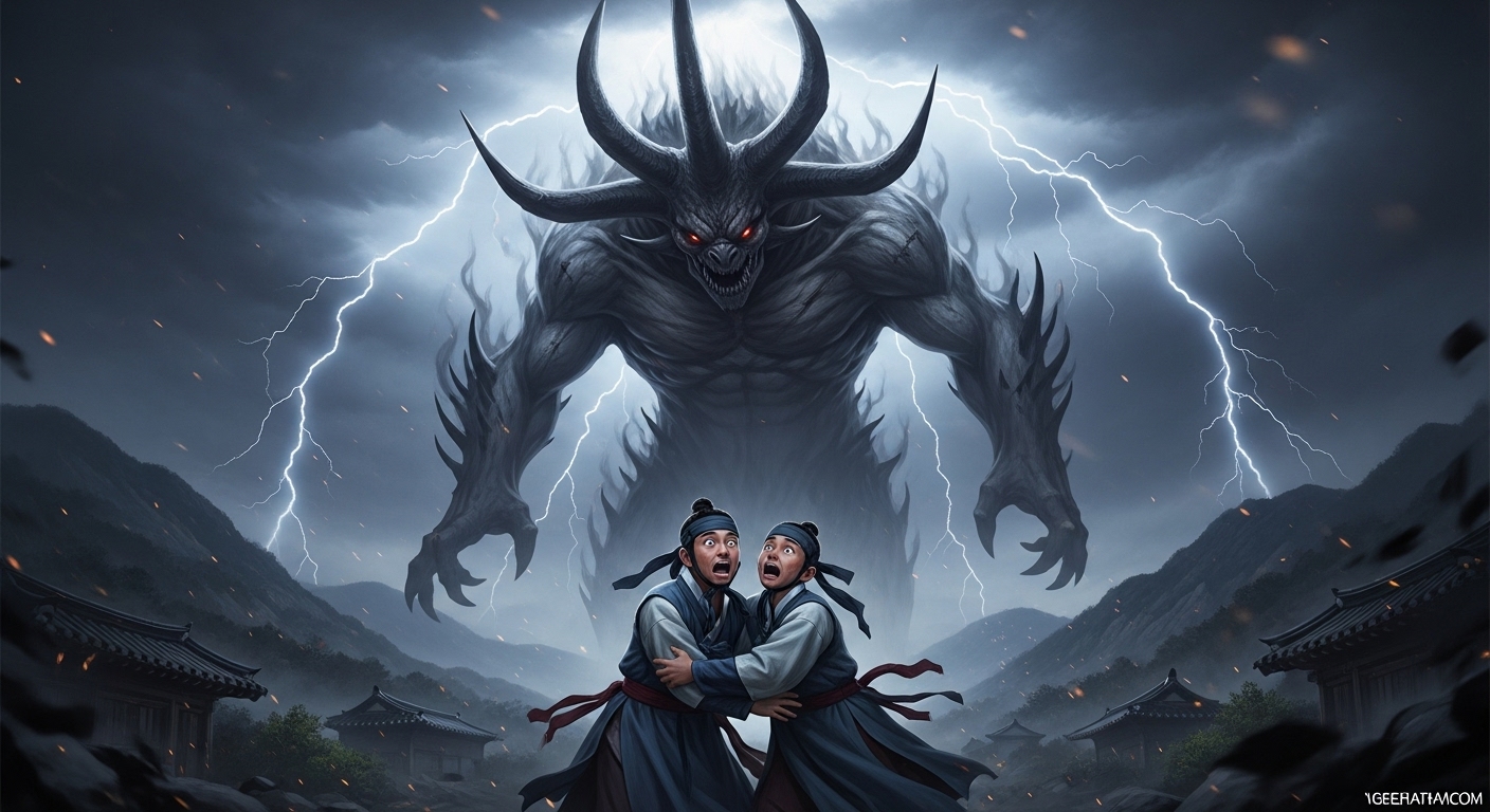 The massive three-horned evil dokkaebi Samgakgui descending from the sky, three times larger than humans with dark evil aura and three horns, the two brothers looking up in fear holding each other, lightning and dark clouds, traditional Korean mountain landscape, apocalyptic atmosphere, photorealistic style, 16:9 aspect ratio