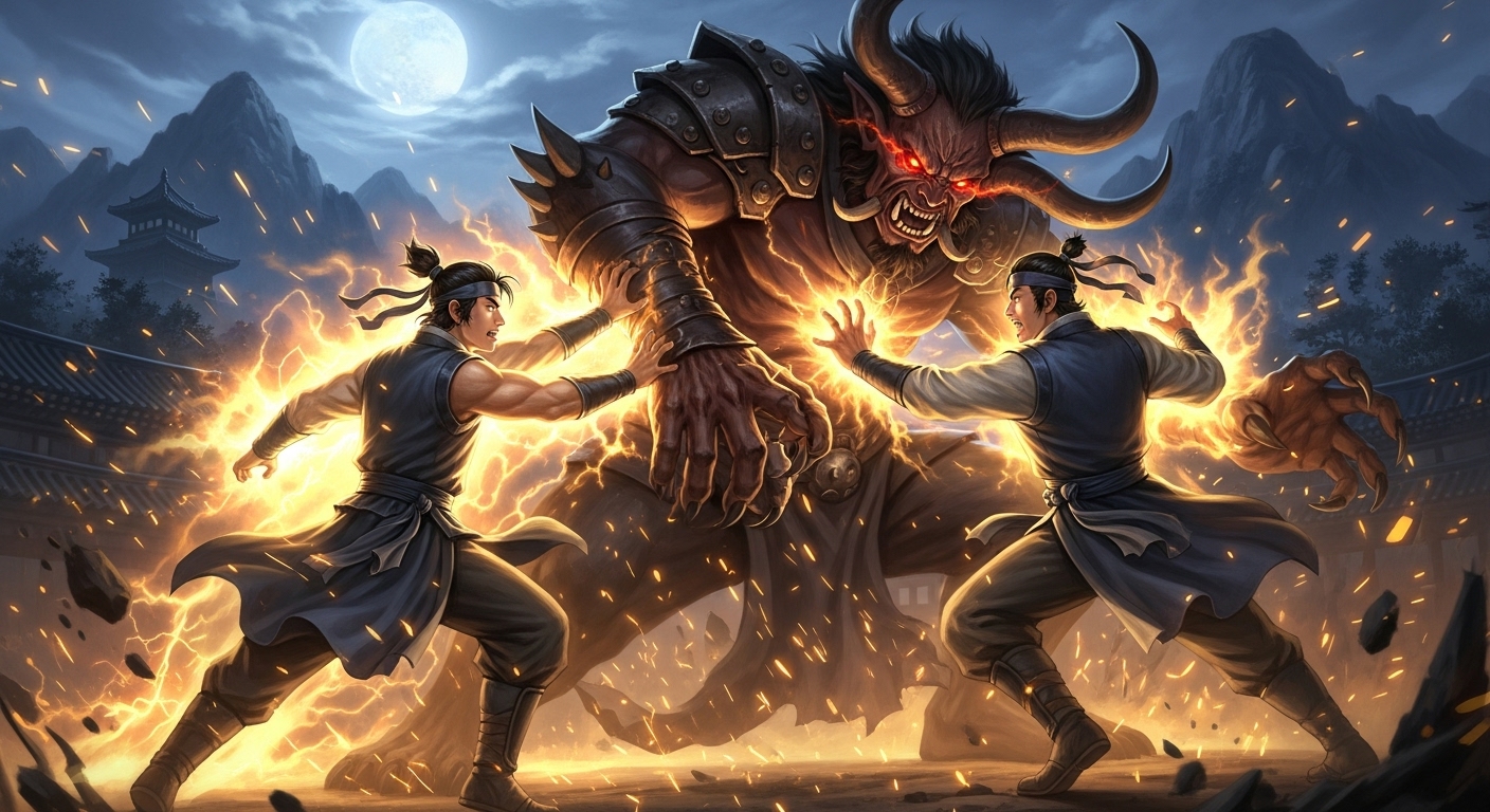 Epic battle scene of two brothers together wrestling the giant three-horned dokkaebi, both brothers glowing with golden light of brotherly love, the evil dokkaebi being pushed back, dramatic action pose, traditional Korean mountain setting at night, magical energy effects, heroic atmosphere, photorealistic style, 16:9 aspect ratio