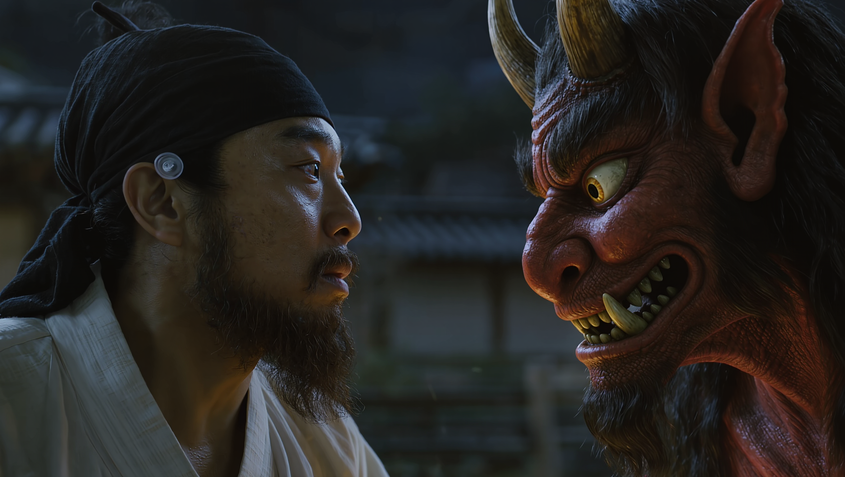 Close-up of a terrified Joseon farmer's face meeting a friendly dokkaebi's eyes for the first time, the dokkaebi has a mischievous grin with glowing red skin and a horn, traditional Korean village in soft focus background, moonlight illuminating their faces, emotional tension, photorealistic style, 16:9 aspect ratio