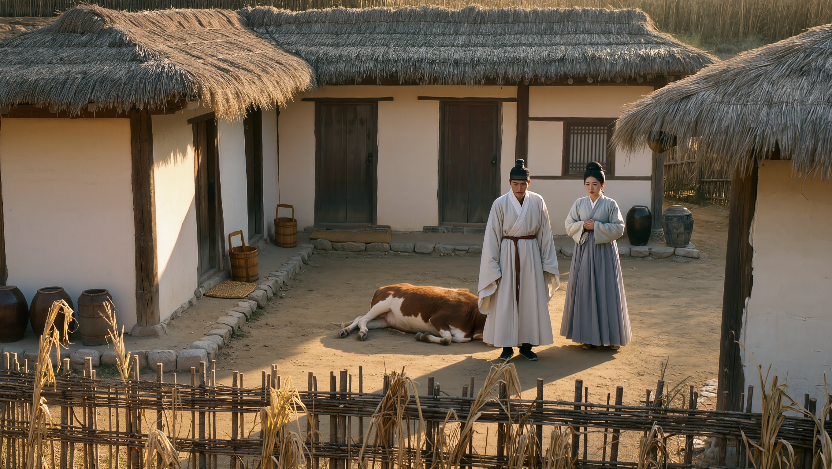 A small Joseon Dynasty farmhouse courtyard in morning light, dead cow lying in the yard, wilted crops in the field, worried farmer in hanbok with sangtu hairstyle and his wife in hanbok with jjokjin meori (traditional braided hairstyle) looking distressed, traditional Korean thatched-roof house, realistic period details, somber atmosphere, photorealistic style, 16:9 aspect ratio