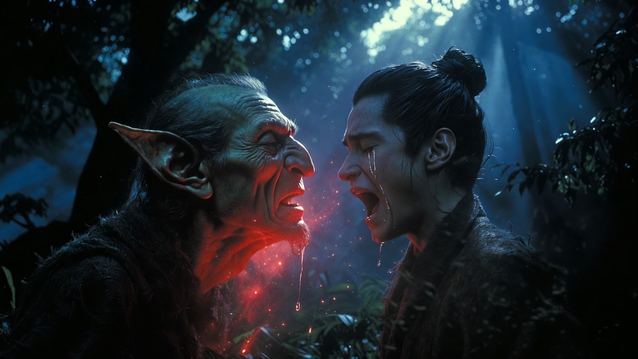 Dramatic transformation scene as the dokkaebi's red glow fades revealing a human man underneath, the farmer's shocked face recognizing his lost brother, magical particles dissolving in the air, emotional reunion moment, moonlit forest setting, tears visible on both faces, photorealistic style, 16:9 aspect ratio
