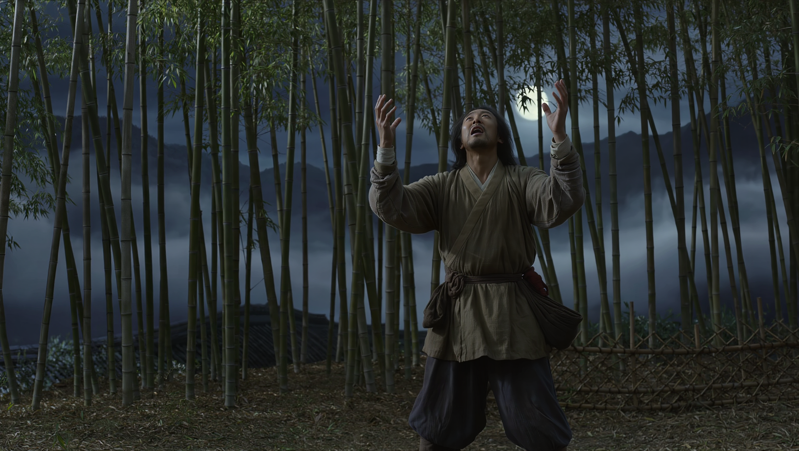 Night scene of the desperate farmer alone in the bamboo forest calling out to the dokkaebi, hands raised pleading to the sky, moonlight streaming through bamboo stalks, emotional desperation on his face, traditional Korean mountains in background, mystical fog, photorealistic style, 16:9 aspect ratio