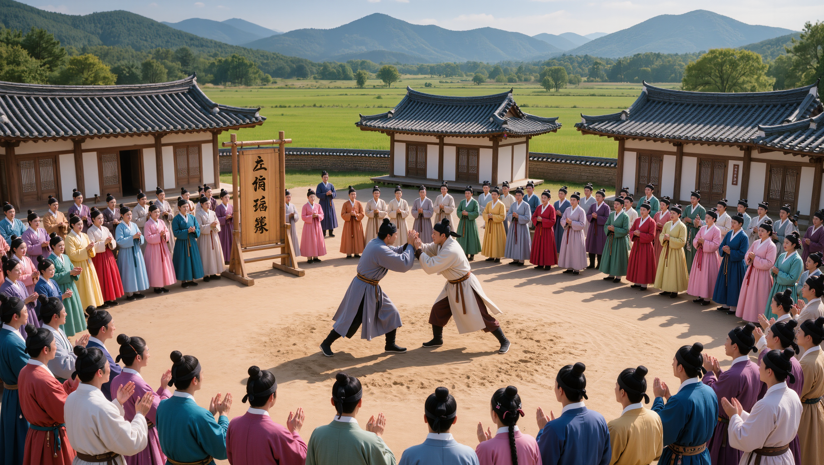 A traditional Korean ssireum (wrestling) competition in a Joseon village square, people in hanbok watching and cheering, a wooden sign reading "진자진승" (the one who loses wins), farmers wrestling playfully, festive atmosphere with traditional Korean houses and mountains in background, bright sunny day, photorealistic style, 16:9 aspect ratio