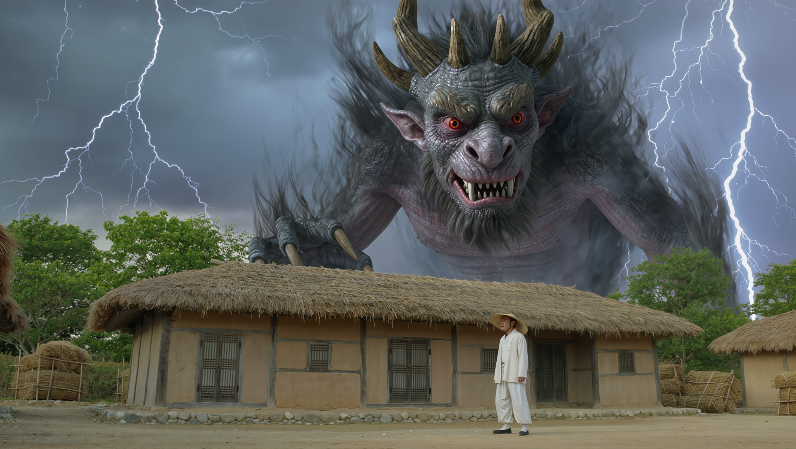 The giant evil dokkaebi appearing in the sky above the farmhouse, three times larger than normal with three horns and dark aura, the farmer looking up in shock from the ground, dramatic storm clouds, lightning effects, ominous atmosphere, traditional Korean village setting, photorealistic style, 16:9 aspect ratio