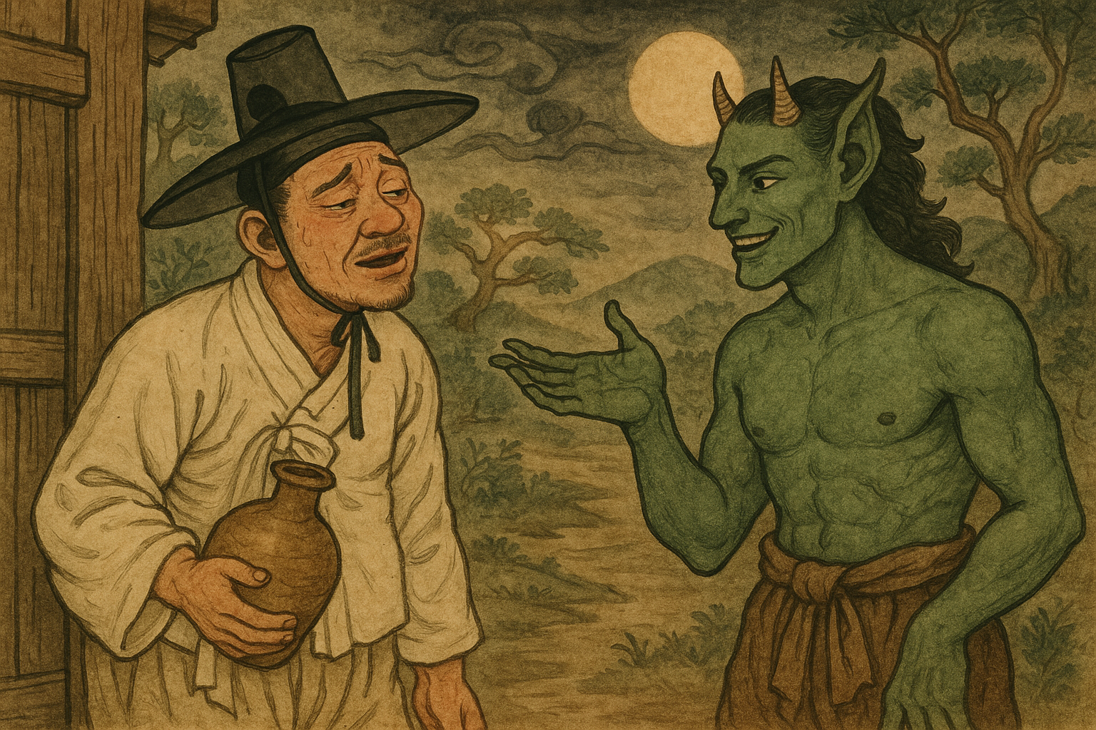 도깨비가 환한 미소를 지으며 김 서방의 손을 꽉 잡았다. 그 순간 김 서방은 머리가 어지러워지며 정신을 잃었다. 주막 안의 모든 것이 빙글빙글 돌면서 김 서방의 의식은 어둠 속으로 빨려 들어갔다.