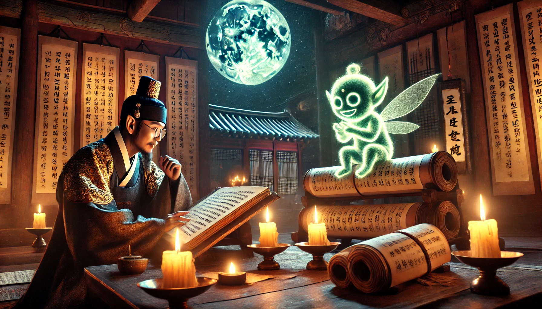 밤이 깊어가는 시간, 세종과 도깨비는 다시 궁으로 돌아와 아무도 모르는 비밀 서재에 자리했다. 창문 너머로 흘러드는 달빛이 방 안을 은은하게 비추었다. 세종은 붓과 먹을 준비하고 종이를 펼쳤다. 마음속에 형태를 갖추기 시작한 글자들을 담아내기 위해서였다. 도깨비는 세종의 옆에서 조용히 지켜보며 때때로 조언을 건넸다.