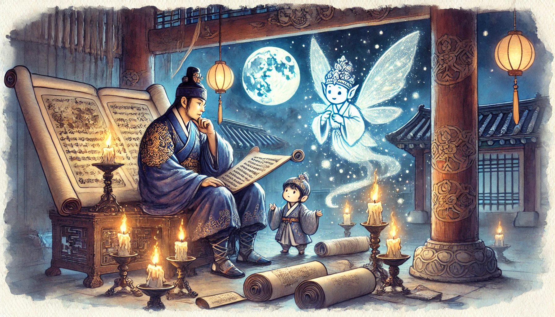 세종은 놀랍게도 두려움보다는 묘한 친근감을 느꼈다. "내가 너무 피곤한 탓에 헛것을 보는 것인가..." 그런 생각을 읽기라도 한 듯, 도깨비는 장난스러운 눈빛으로 웃으며 책상 위의 물건들을 공중에 띄웠다. 붓과 먹, 종이가 공중에서 춤을 추듯 움직이는 모습에 세종은 놀라움을 감추지 못했다.