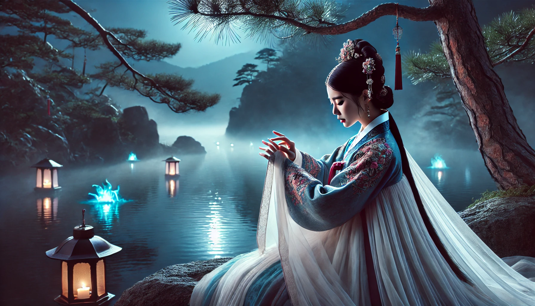 깊은 산자락에 안겨 있는 청룡호수는 보름달이 뜨는 밤이면 신비로운 모습을 드러냅니다. 은빛 달무리가 물 위에 아름답게 어리고, 밤안개가 호수 위를 덮으면 마치 구름 위를 걷는 듯한 환상적인 풍경이 펼쳐집니다. 그러나 마을 사람들은 이 아름다운 호수에 가까이 가지 않습니다. 밤이 되면 호수 위로 푸른빛 도깨비불이 떠오르고, 바람 소리에 섞여 애절한 여인의 노래가 들려온다고 합니다. 대대로 전해 내려오는 이 호수의 전설은 조선 숙종 시대로 거슬러 올라갑니다.