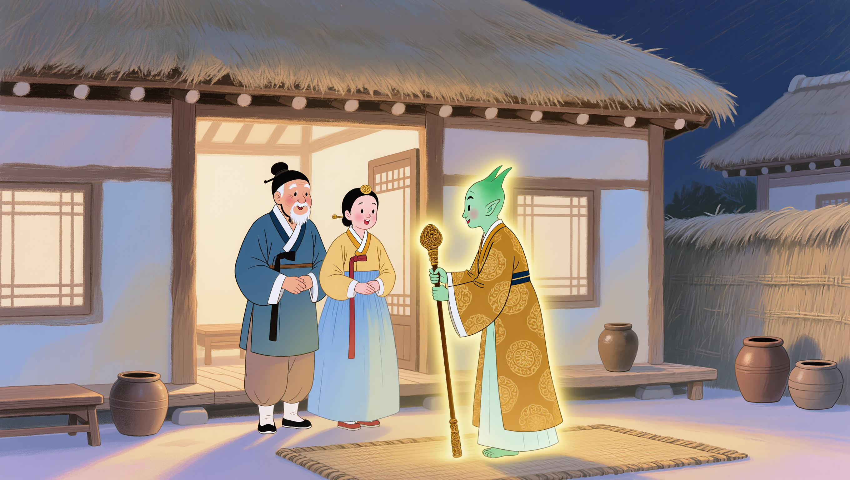 여러분, 도깨비 방망이가 정말로 존재했다는 이야기를 들어보셨습니까? 조선시대 어우야담에 실린 실화를 바탕으로 한 이야기입니다. 가난하지만 마음씨 착한 한 부부가 어느 날 밤 이상한 손님을 맞이하게 됩니다. 그 손님은 다름 아닌 도깨비였는데요, 이 도깨비와의 만남이 부부의 인생을 완전히 바꿔놓게 됩니다. 과연 도깨비는 왜 이 가난한 부부를 찾아왔을까요? 그리고 도깨비 방망이는 정말로 소원을 이루어줬을까요? 우리 조상들이 전해준 신비롭고도 교훈적인 이야기, 지금 시작합니다.