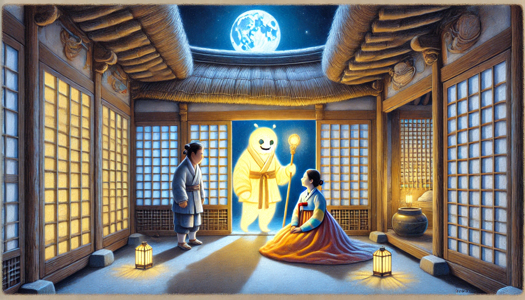 "도깨비는 사람들이 생각하는 것처럼 나쁜 존재가 아닙니다. 우리는 선한 사람에게는 복을 주고 악한 사람에게는 벌을 주는 존재입니다. 이 방망이는 우리 도깨비들이 쓰는 보물인데, 소원을 이루어주는 힘이 있습니다." 도깨비는 방망이를 부부 앞으로 내밀었습니다. 방망이에서는 은은한 빛이 흘러나왔습니다.