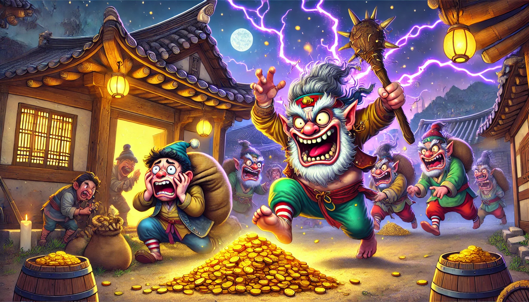 "인간 놈, 우리 방망이로 네 욕심을 채웠구나? 이제 그 대가를 치를 시간이다!"