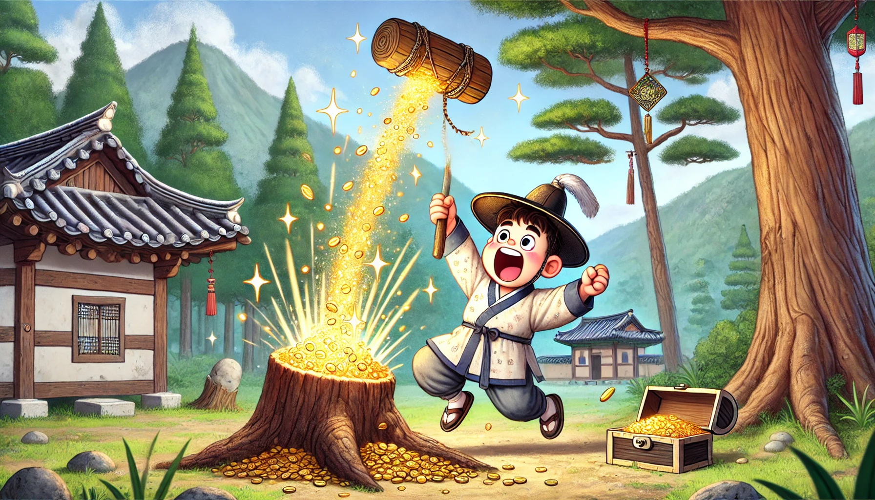 "도깨비 방망이, 어서 두드려 금은보화를 내오게!"