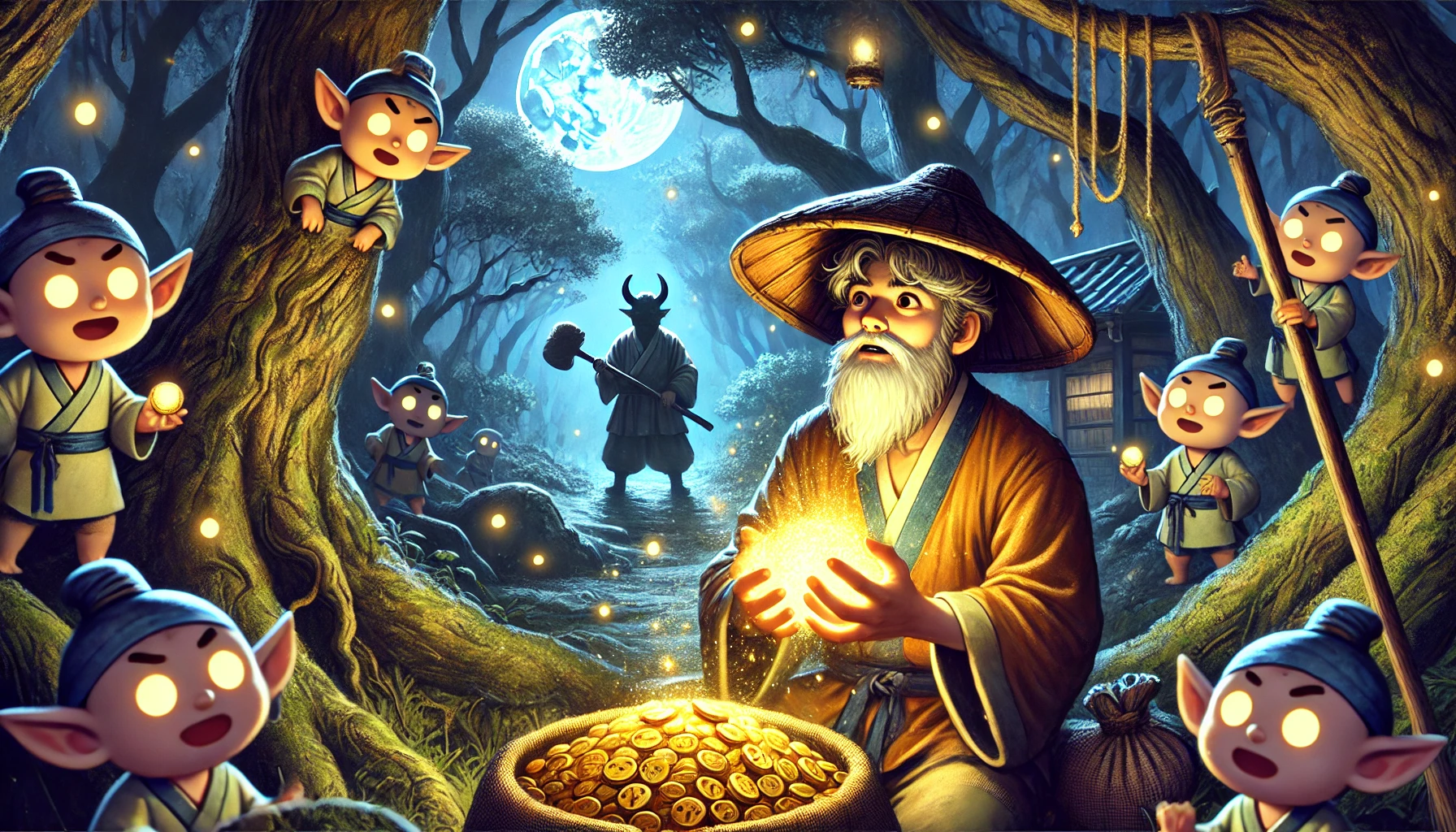 그 순간, 금은보화의 길이 흔들리더니 연기처럼 사라졌고, 소박한 마을로 가는 길만 남았습니다. 도깨비는 만족스러운 미소를 지었습니다.