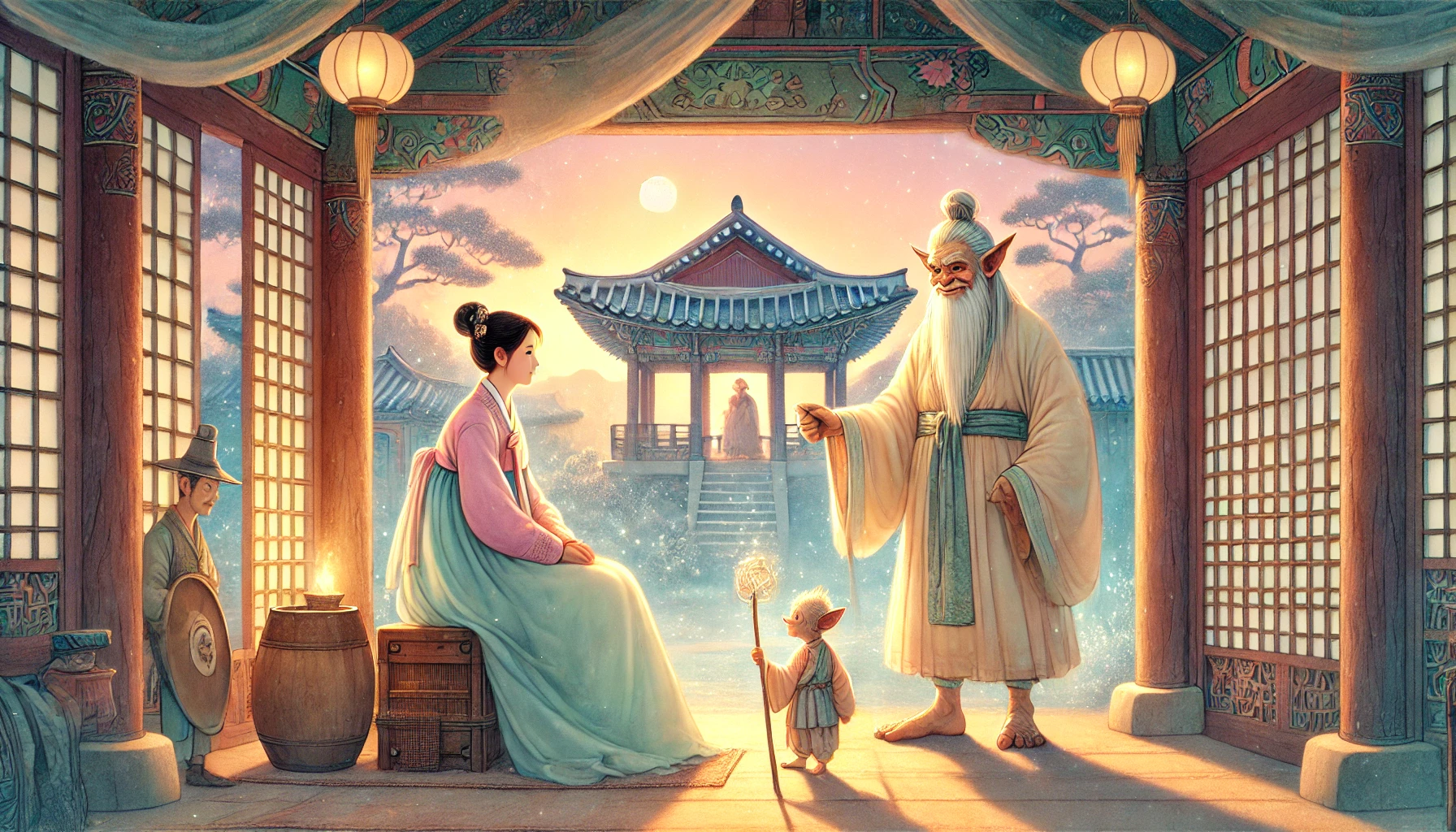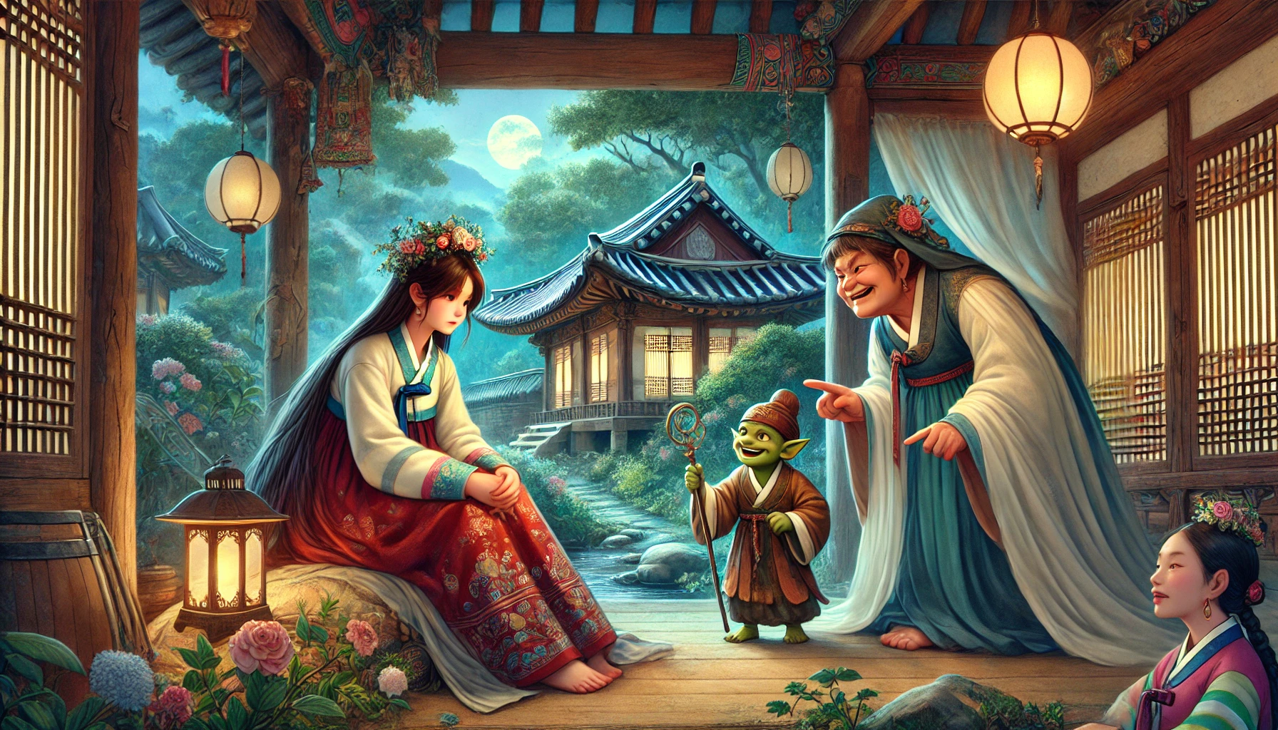 그날 밤, 며느리는 잠자리에 들며 남몰래 흐느꼈다. 어두운 방 안에서, 문득 창밖에서 희미한 빛이 스쳐 지나갔다. 깜짝 놀라 몸을 일으킨 그녀는 창문 너머를 바라보았다. 그리고 그곳에는 낮에 만났던 도깨비가 서 있었다.