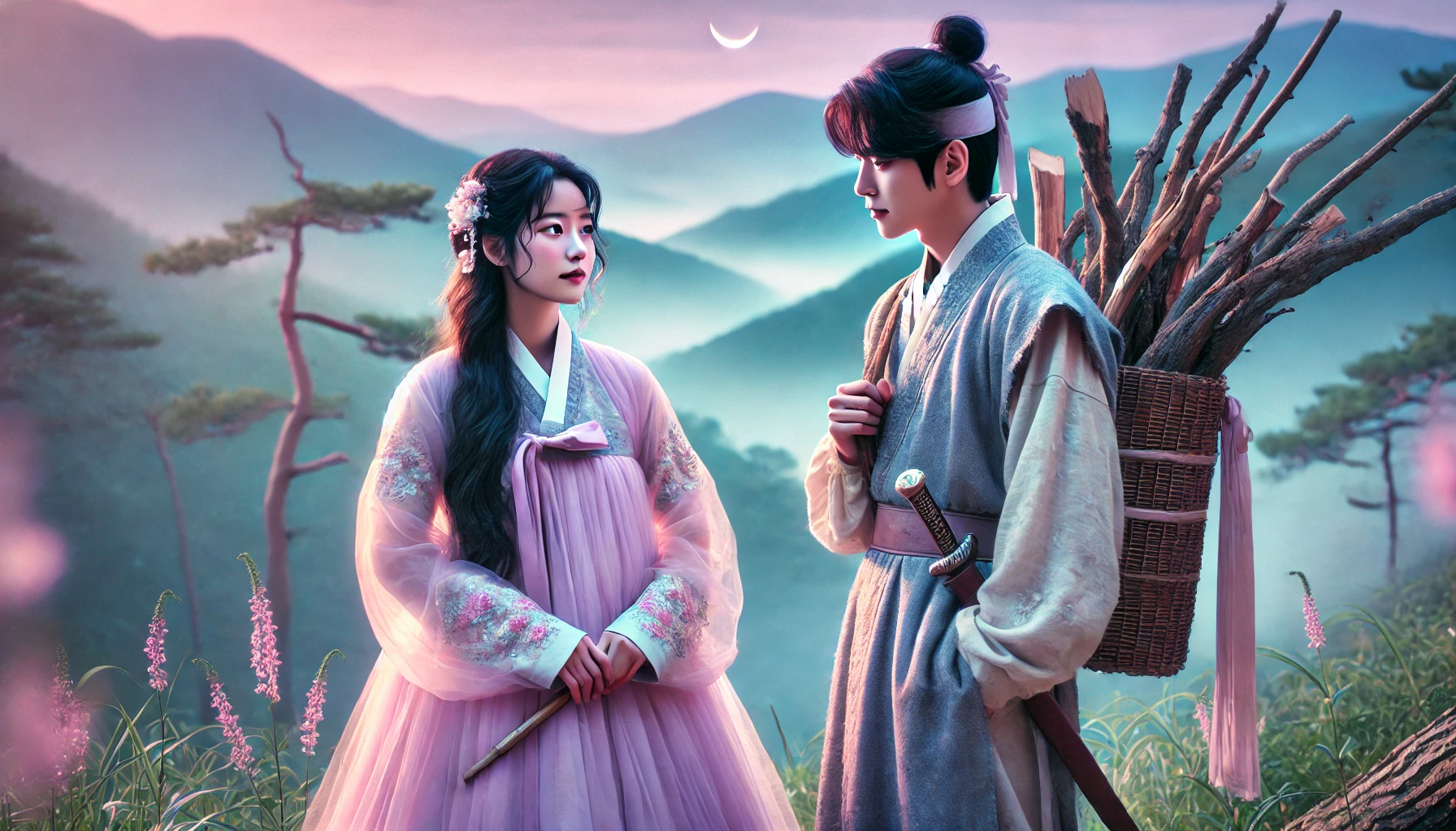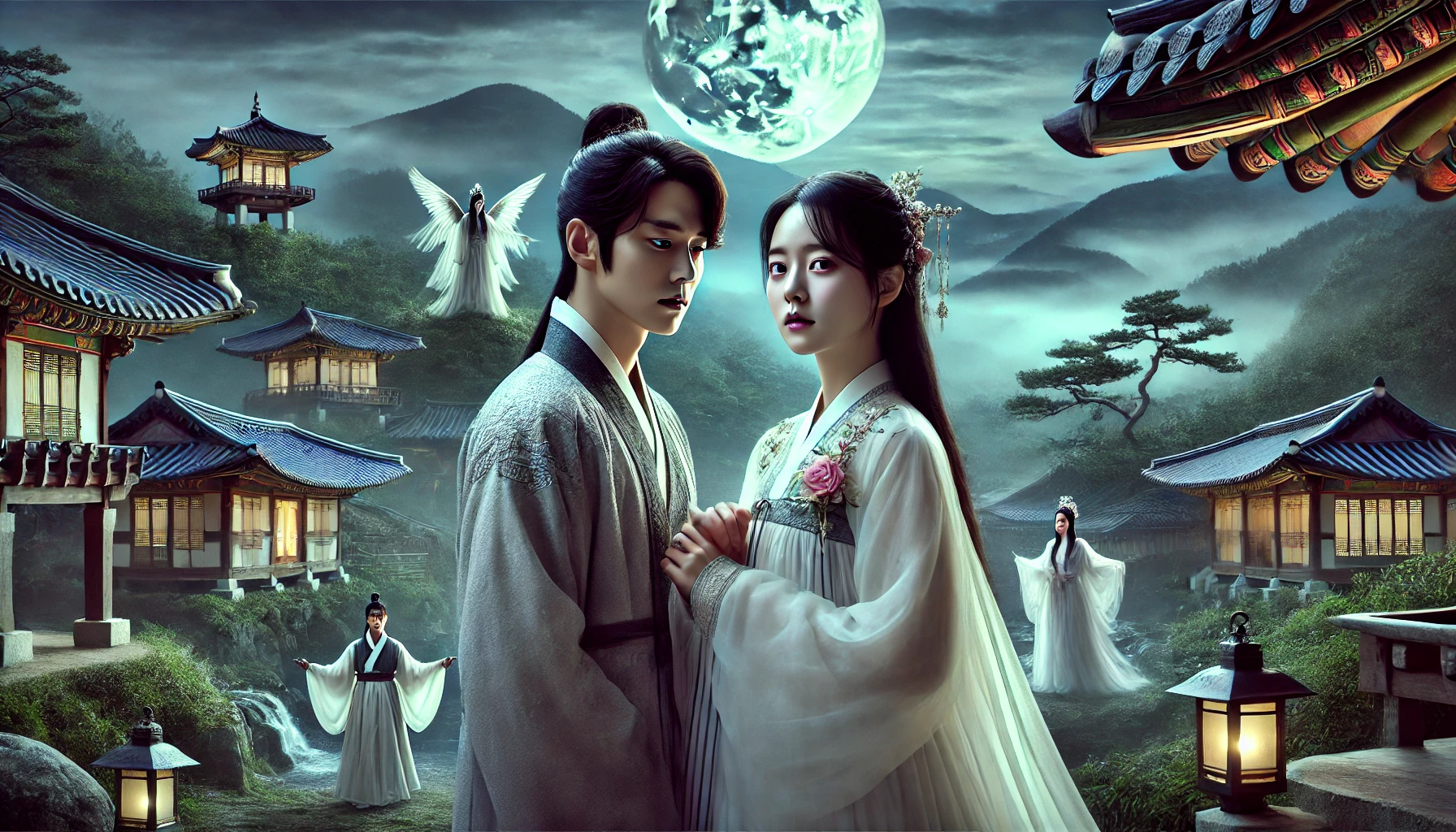 놀라 뒤돌아보니, 달빛에 비친 아름다운 여인이 서 있었습니다. 긴 검은 머리카락과 달빛처럼 창백한 피부, 그리고 이상하게 빛나는 푸른 눈동자를 가진 여인이었습니다. 그녀는 평범한 조선의 옷을 입고 있었지만, 어딘가 이질적인 분위기를 풍겼습니다.
