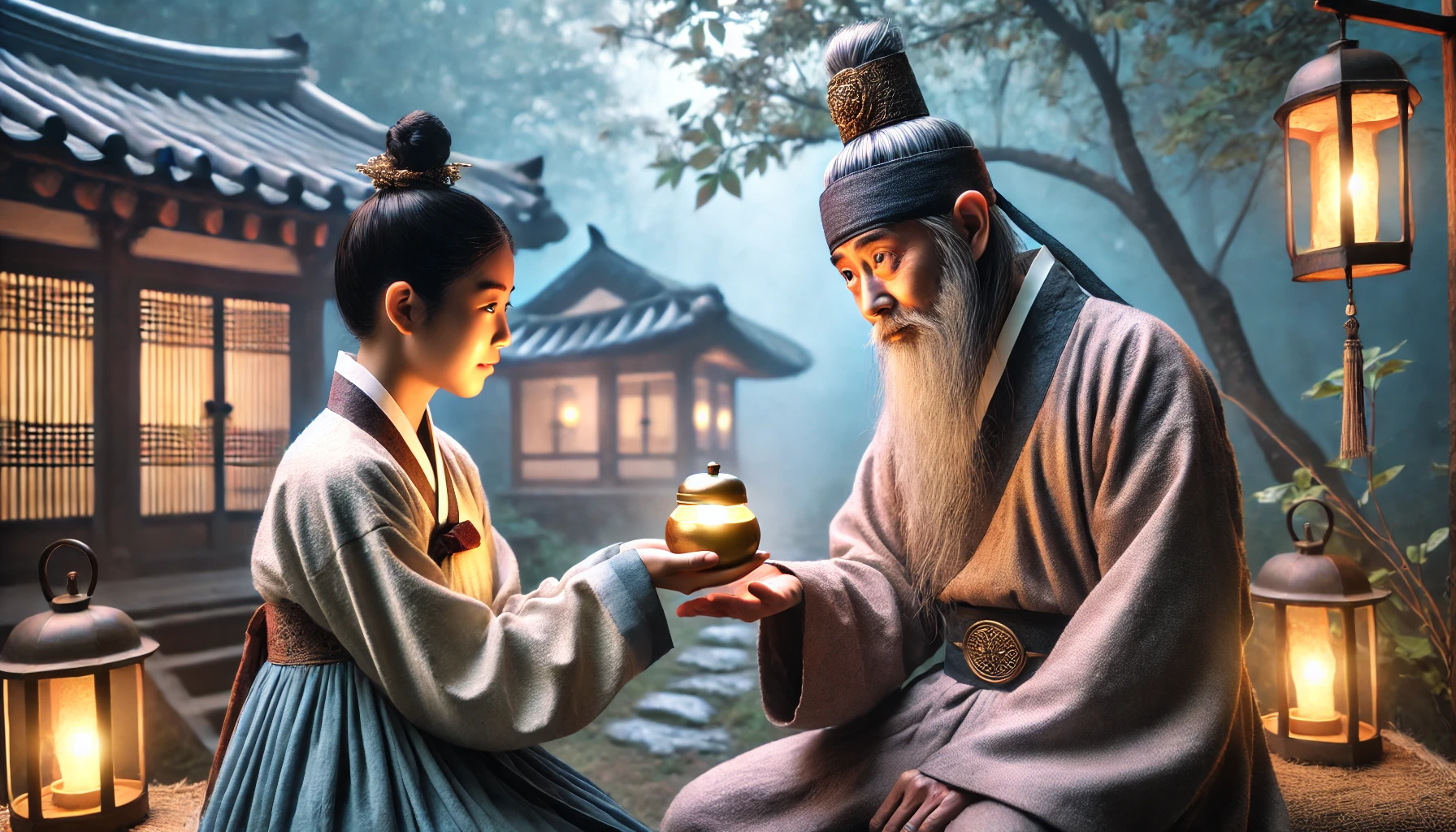 도깨비는 작은 주머니를 만복에게 건넸습니다. "이것은 약이 아니라 지혜의 씨앗이다. 이것을 마음에 심으면, 미래를 보지는 못해도 현명한 선택을 할 수 있을 것이다."