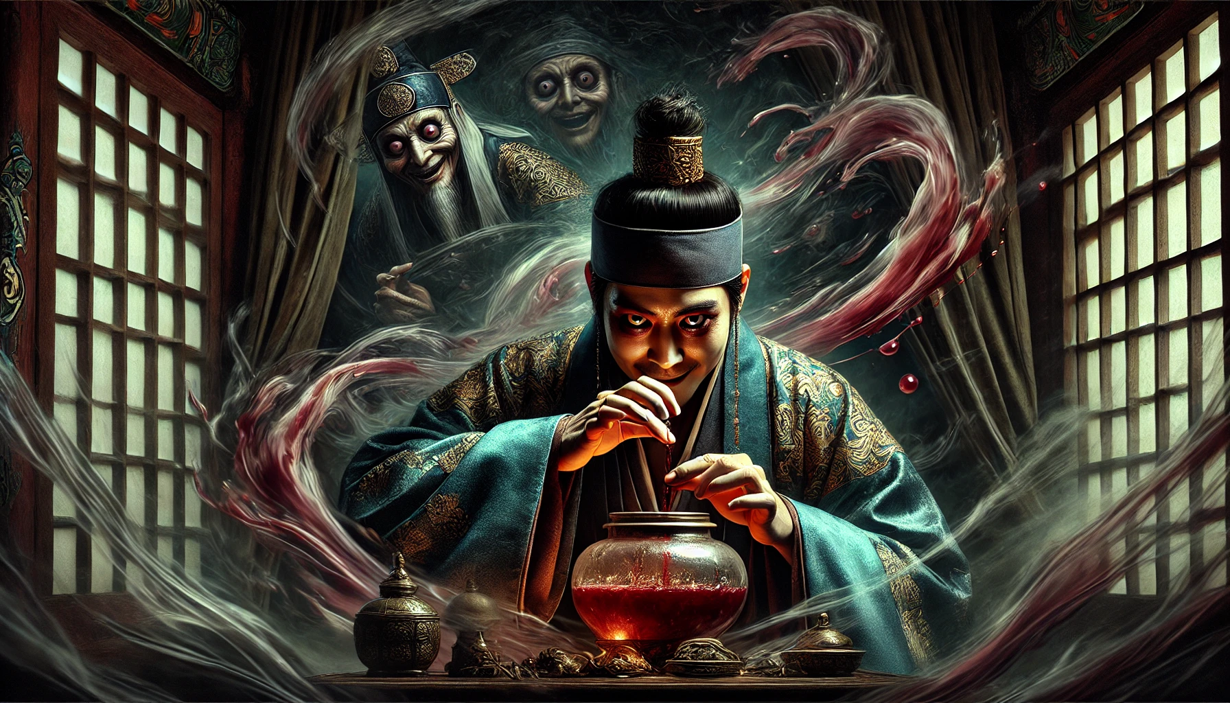 박상궁은 경고를 무시한 채 환약을 입에 넣고 삼켰습니다. 그 순간, 그의 눈이 붉게 빛나기 시작했고, 온몸이 떨리기 시작했습니다. "이... 이것은? 내 몸이... 아악!"