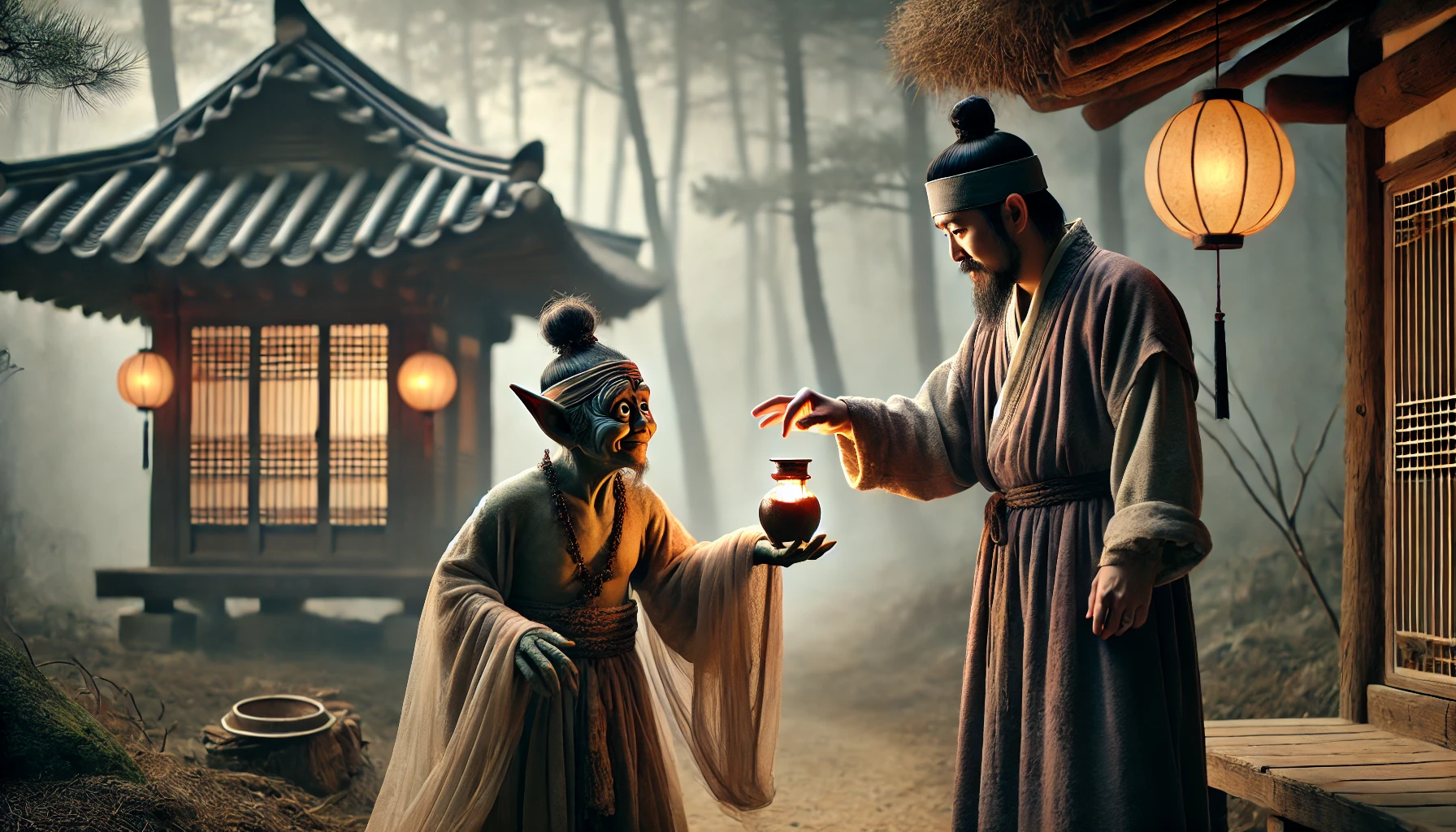 도인도 덧붙였습니다. "도깨비는 인간의 욕심을 시험하는 존재라오. 그들의 선물에는 항상 대가가 따르지."