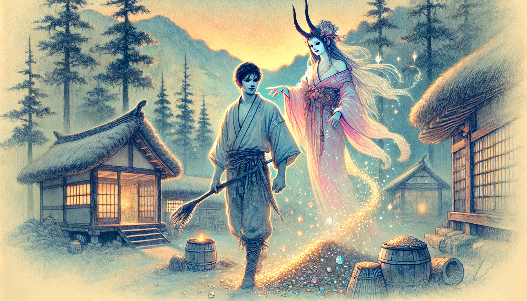 하지만 도깨비의 구애는 여기서 멈추지 않았습니다. 다음 날 밤에는 산삼이며 녹용 같은 귀한 약초들이 산더미처럼 쌓였고, 그 다음 날에는 비단 옷감이 마당을 뒤덮었습니다. 마을 사람들은 박 서방네 터가 명당이라며 부러워했지만, 정작 박 서방은 밤마다 들려오는 기이한 웃음소리와, 방문 창호지에 어리는 여인의 그림자 때문에 공포에 떨기 시작했습니다. 도깨비는 인간의 마음을 얻는 법을 몰라 그저 재물로 밀어붙였지만, 박 서방에게는 그저 귀신 곡할 노릇이었던 것입니다.