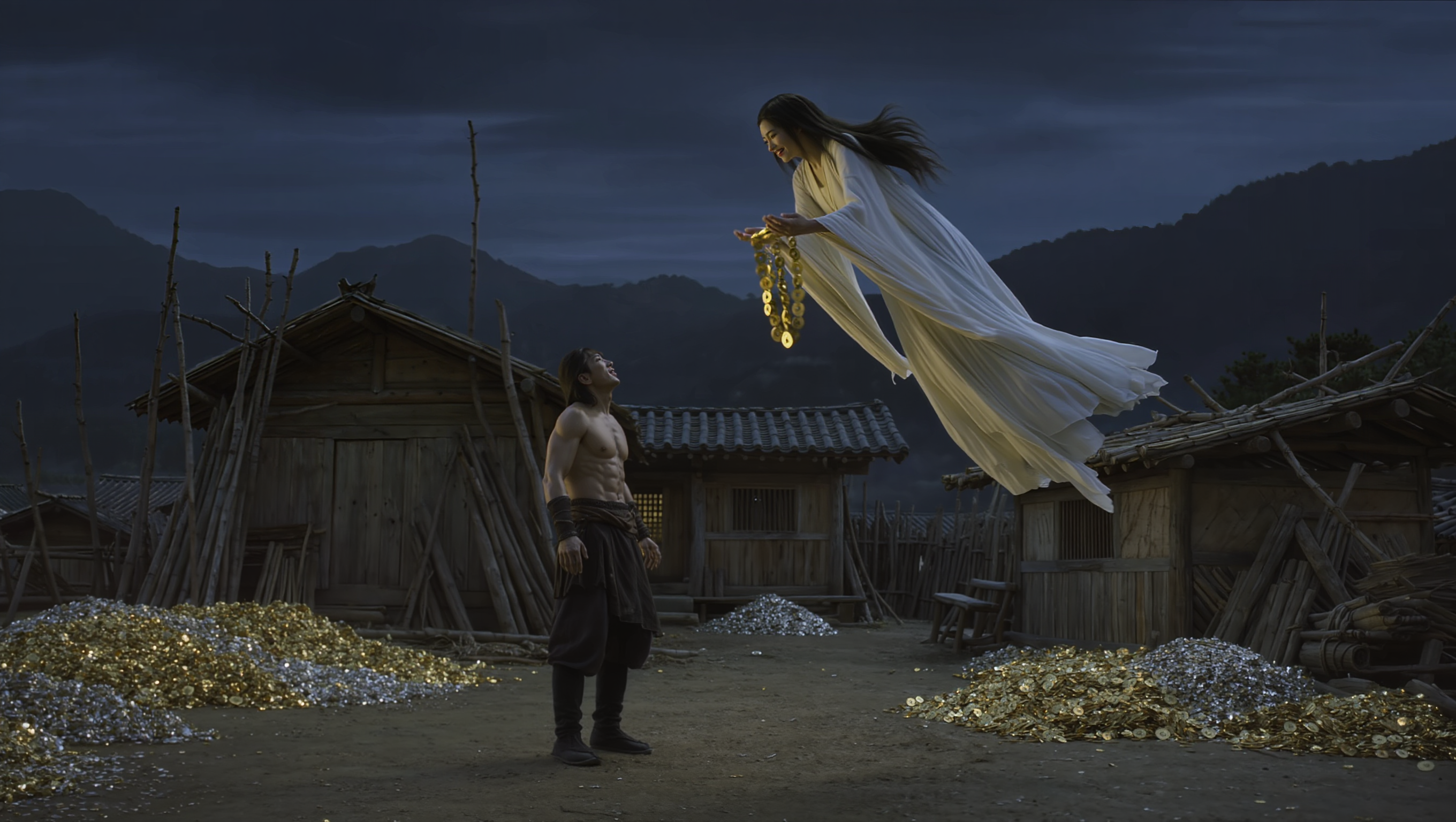 그날 밤, 박 서방이 사는 다 쓰러져가는 초가삼간에는 적막만이 감돌고 있었습니다. 홀어머니를 모시고 사는 효자였으나 찢어지게 가난하여 장가갈 엄두도 못 내던 박 서방은, 낮에 계곡에서 느꼈던 묘한 한기를 잊으려 일찍 잠자리에 들었습니다. 그런데 삼경쯤 되었을까, 지붕 위에서 우당탕탕 하는 소리가 들리더니 마당에 무언가 후두둑 떨어지는 소리가 요란하게 났습니다. 도둑이라도 들었나 싶어 박 서방이 방문을 빼꼼히 열어보니, 아니 이게 웬일입니까? 달빛 아래 마당 가득히 반짝이는 것들이 널려 있는데, 그것은 돌멩이가 아니라 순도 높은 금덩어리와 은동전들이었습니다.