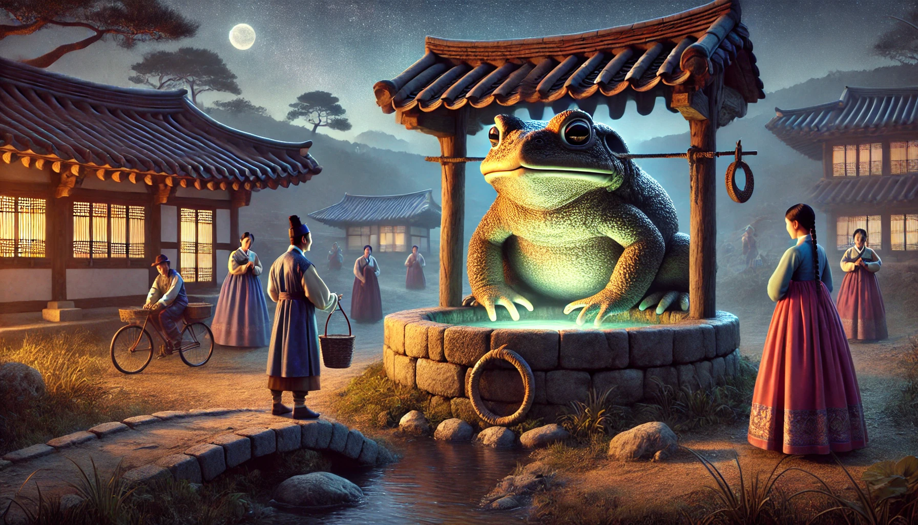 사람들은 두꺼비를 향해 머리를 조아리며 진심 어린 사죄를 올렸다. 그러자 우물가에 앉아 있던 두꺼비가 천천히 몸을 일으켜, 마을 사람들을 바라보았다. 어둠 속에서도 빛나는 두 눈은 깊고도 신비했다.