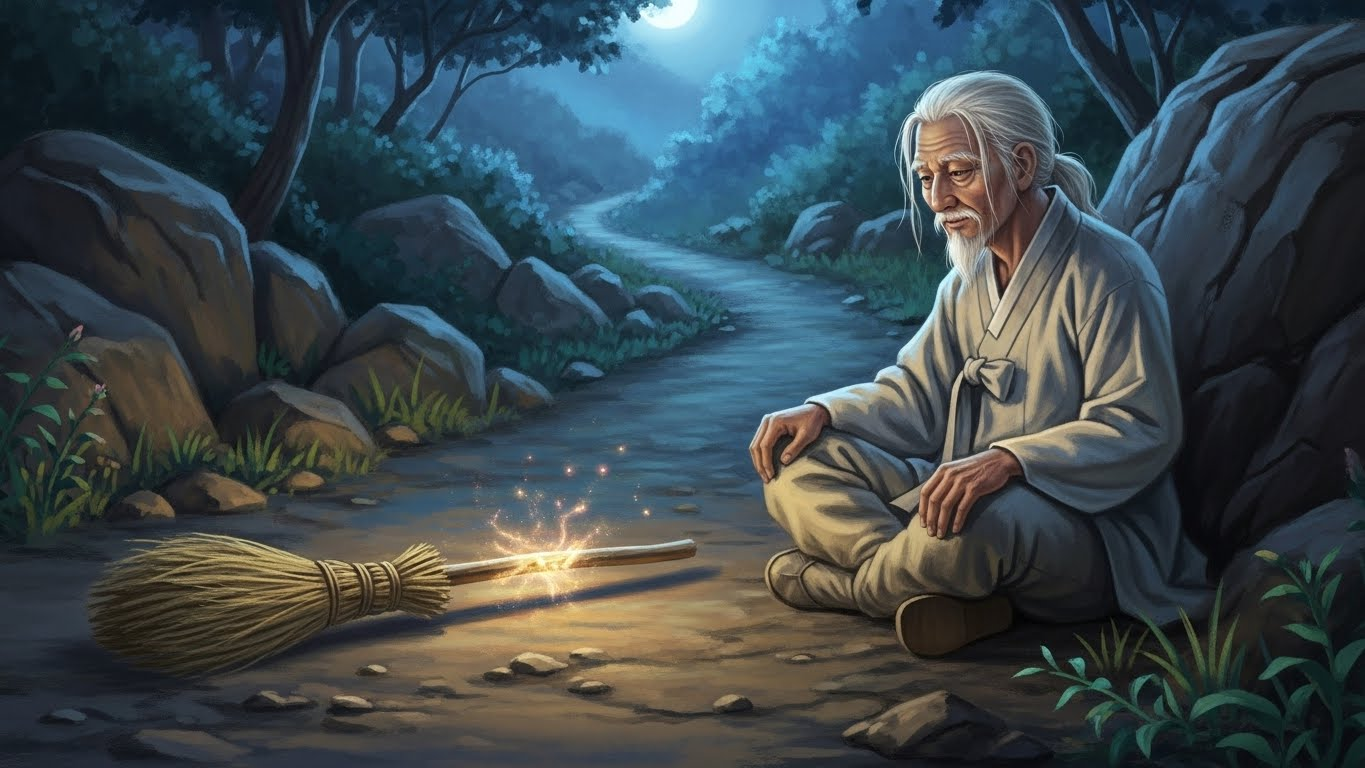 (Tales from the Joseon Era: Legends and Folk Anthologies) A soft pastel painting, 16:9. Years later, night. An old man with white hair (Deukchil) sits by the familiar large rock on the mountain path. He discovers an old, worn-out straw broom glowing with a faint, warm magical aura in the moonlight. A peaceful, nostalgic mood.