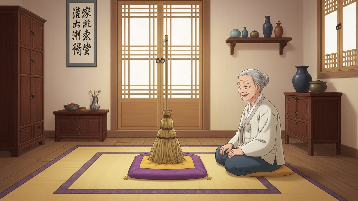 (Tales from the Joseon Era: Legends and Folk Anthologies) A soft pastel painting, 16:9. Interior of a neat, comfortable Korean room. The old, worn-out straw broom sits respectfully on a fine silk cushion in the center of the room. Old Deukchil sits beside it, smiling warmly and talking to it as if it were a person. Warm, gentle, and contented colors.
