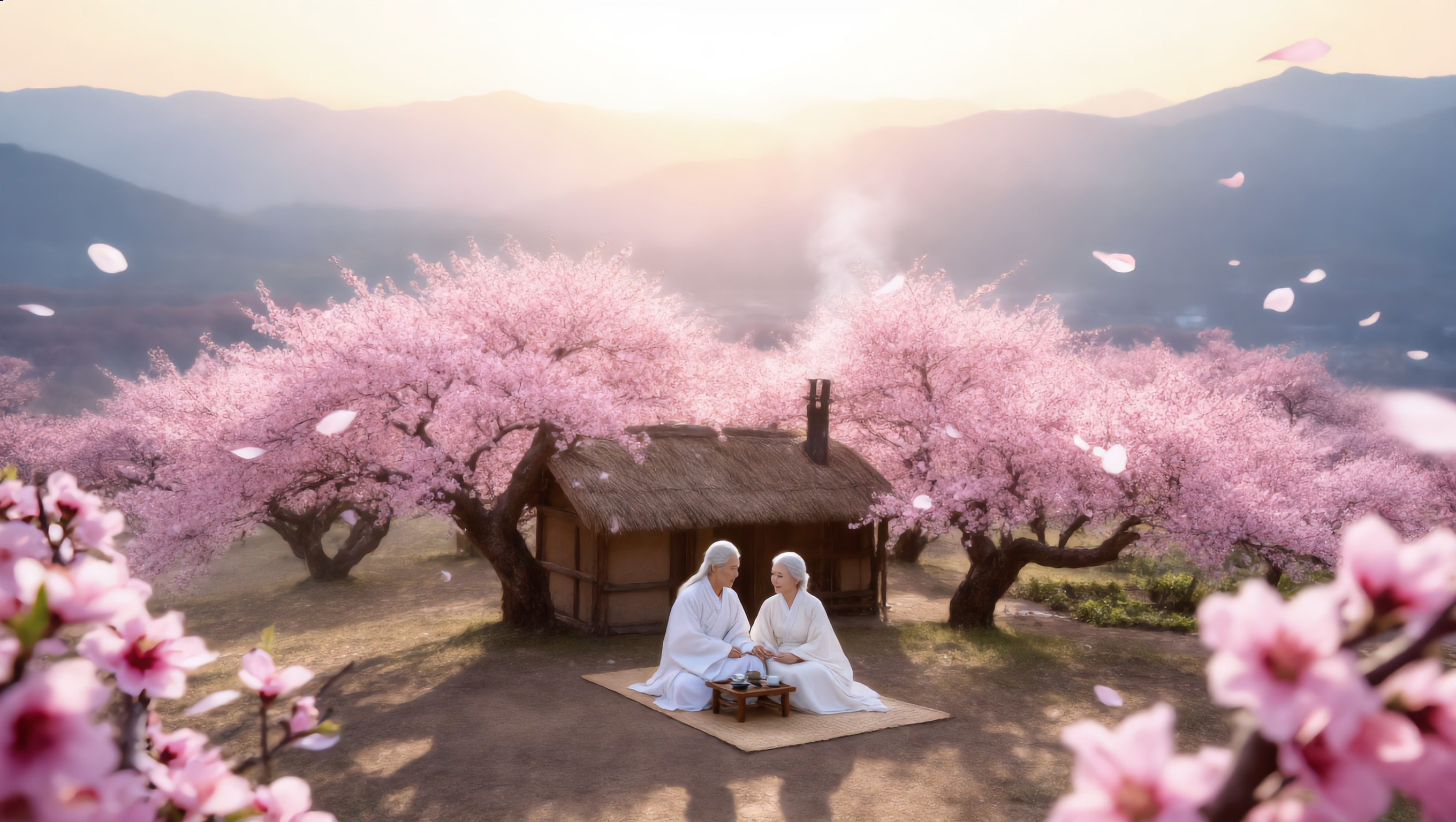 A breathtaking 16:9 cinematic landscape painting in the style of traditional East Asian ink-and-wash with soft photorealistic touches. A small humble thatched-roof hut nestled in a deep mountain valley, completely surrounded by approximately thirty fully blooming pink peach blossom trees creating a soft pink cloud effect. An elderly Korean couple in traditional white hanbok with silver hair, sitting peacefully together on a woven straw mat under the largest peach tree in the foreground, sharing tea from small ceramic cups on a tiny wooden tray. Pink peach petals drifting gently through the air like soft rain, some resting on their shoulders and silver hair. Soft golden afternoon sunlight filtering through the petals, creating dreamy bokeh and warm light rays. Misty distant mountain ridges layered in soft blue-gray tones. A small vegetable garden visible beside the hut, a thin curl of smoke rising from the chimney. Atmosphere of profound serenity, deep marital affection, gentle nostalgia, and timeless peace. Color palette dominated by soft pinks, warm cream, gentle gold, misty pale blue, and earthy browns. Hyper-detailed, ultra-soft lighting, painterly photorealism, evoking Mumlung-doweon (Peach Blossom Spring) utopia, no text, no letters, no logos, no watermarks, no signatures.