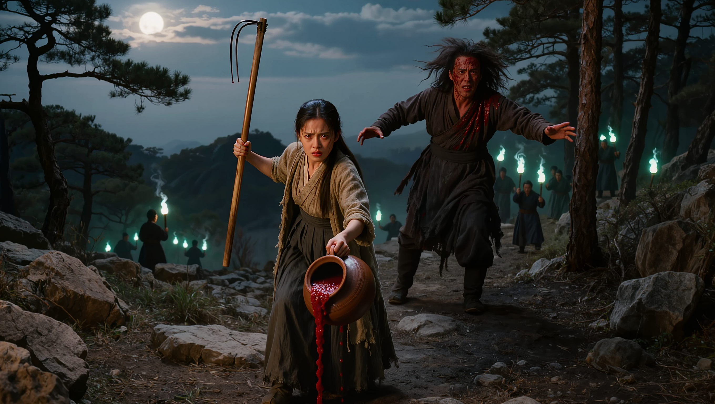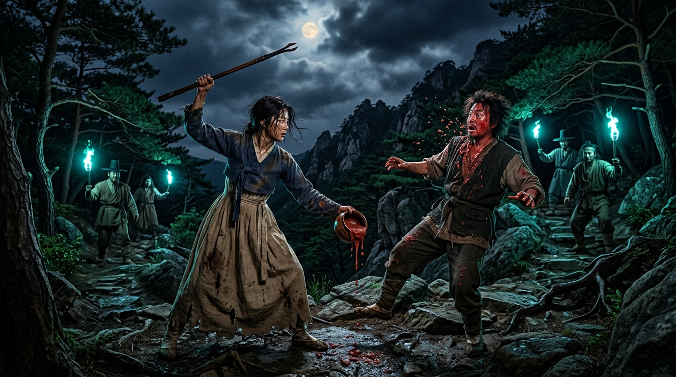 A dramatic photorealistic nighttime scene on a narrow Korean mountain pass in the Joseon Dynasty era. A fierce-looking young Korean woman in a worn hanbok stands defiantly on the rocky trail, holding a long wooden fire poker raised in one hand and a broken earthenware pot in the other. Thick red porridge drips from the pot. Facing her is a towering menacing figure with wild hair and reddish skin, staggering backward with red porridge splattered all over his face, arms flailing in shock. Behind him, several shadowy figures hold eerie blue-green torches that cast an otherworldly glow across the rocky landscape. Pine trees frame the scene on both sides, and a pale moon breaks through clouds above the mountain ridge. The woman's expression is furious and tearful simultaneously, showing raw maternal determination. Cinematic dramatic lighting, photorealistic, 16:9 aspect ratio, no text.