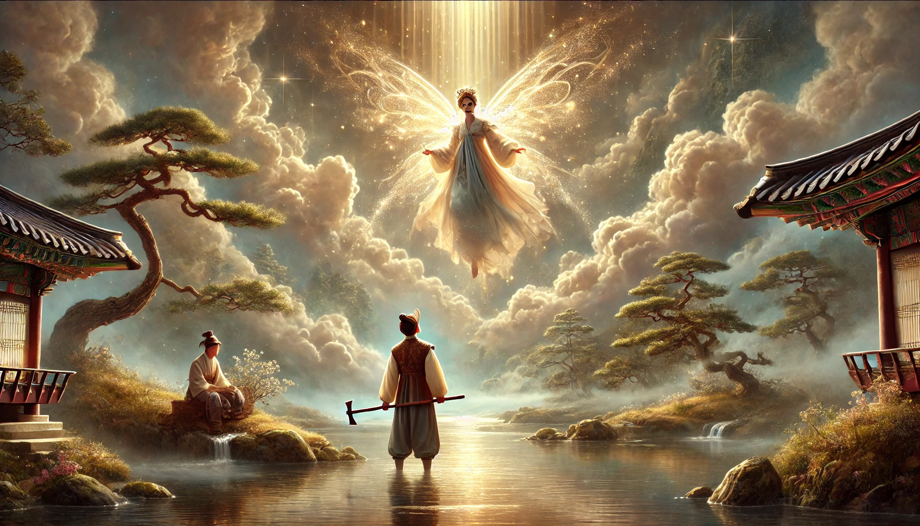 "그렇게 말하는 그대의 왼뺨에 있는 반점, 그것은 전생에 하늘과 맺은 인연의 흔적이니라. 저기 있는 선녀들 중 가장 빛이 약한 이는 벌을 받아 인간 세상에 내려온 것이니, 그대가 원한다면 그녀의 날개옷을 숨겨 인연을 맺을 수 있으리라."