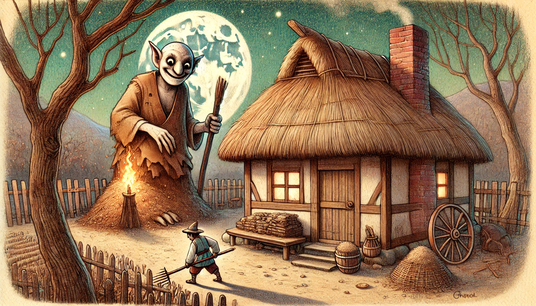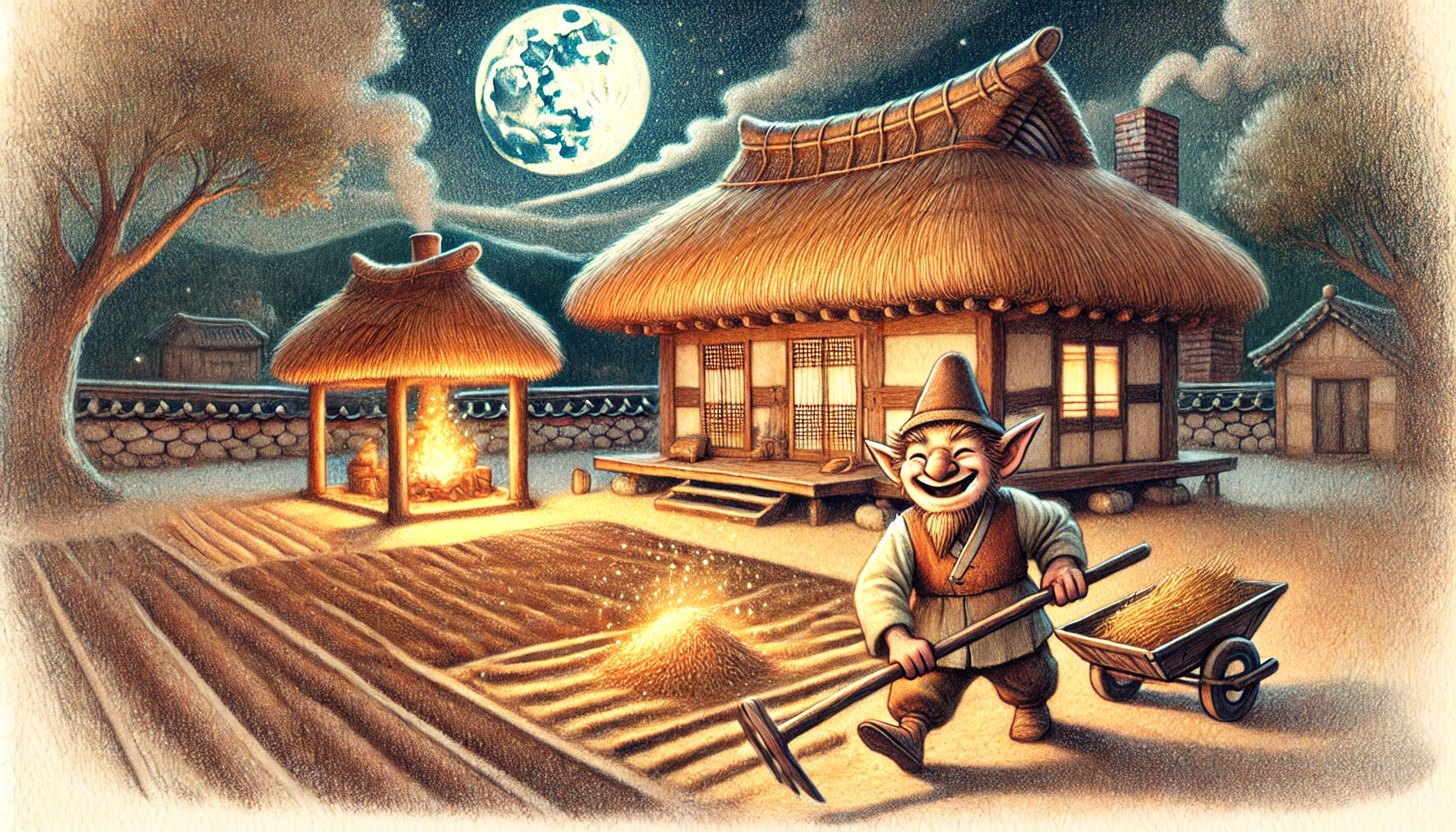 그날부터 도깨비는 밤낮으로 더욱 부지런히 일했고, 김진사는 모아둔 곡식을 마을 사람들에게 나누어주었습니다. 마을 사람들은 김진사의 은혜에 감사했고, 김진사 댁을 '의로운 집'이라 불렀습니다. 어떤 이는 물었습니다. "김진사, 당신네 집은 어찌 이리 넉넉하오? 흉년에도 남을 도울 여유가 있다니 신기하오." 김진사는 그저 미소 지으며 대답했습니다. "하늘이 도운 것이오. 그리고 부지런히 일한 덕이지요." 도깨비의 정체는 끝까지 비밀로 지켰습니다. 사람들이 알면 오히려 도깨비에게 해가 될까 걱정되었기 때문입니다. 도깨비도 그것을 고맙게 여겼습니다. 밤마다 더욱 열심히 일하며 김진사 가족과 마을 사람들을 돕는 것이 도깨비에게는 세상에서 가장 행복한 일이었습니다.