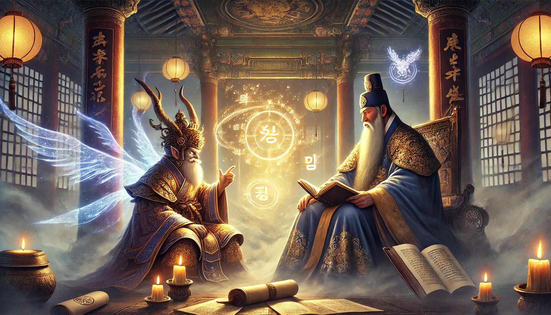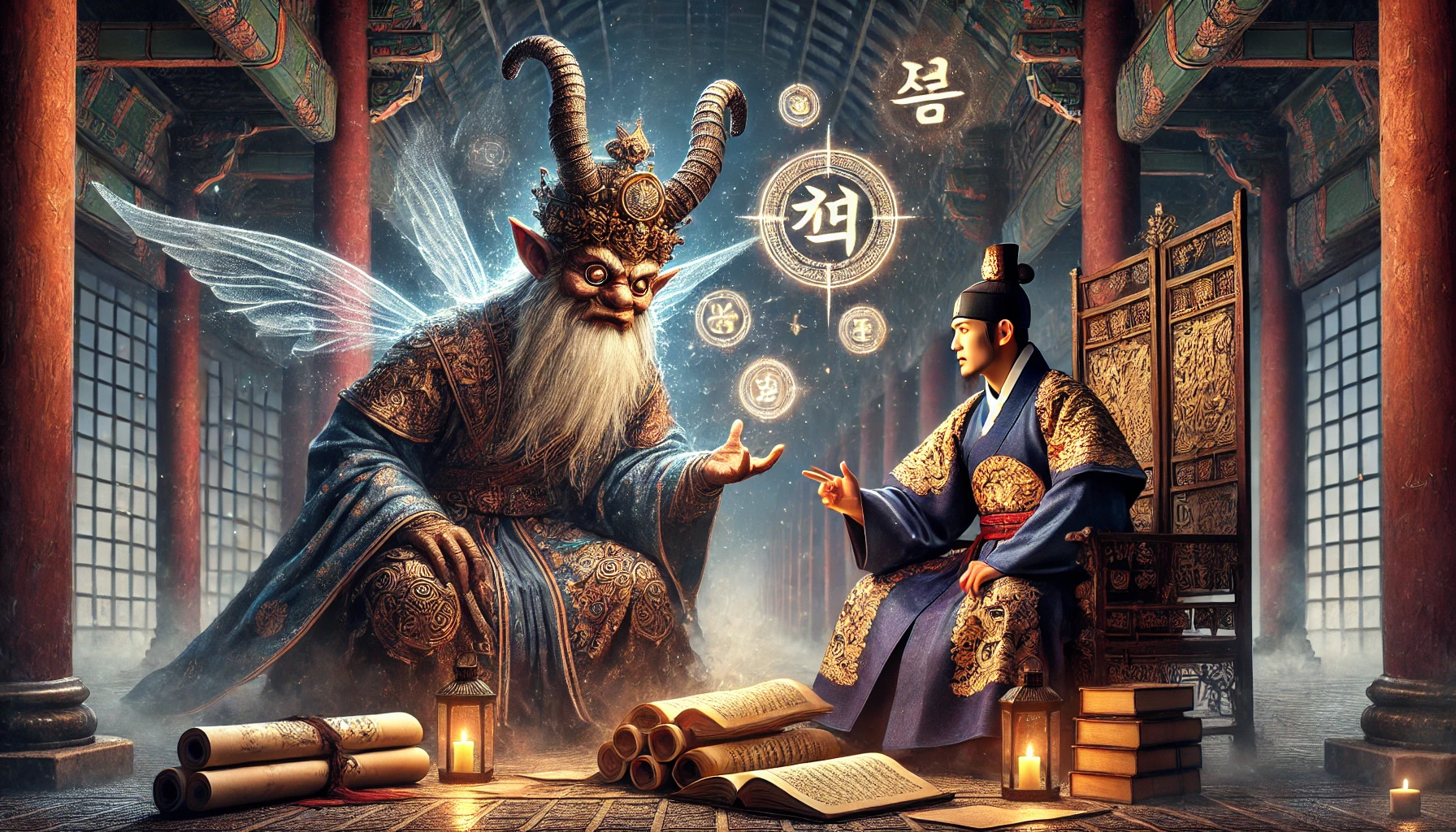 세종은 잠시 생각했다. 요즘 새로운 문자 창제 때문에 고민이 깊었는데, 혹시 이 도깨비와의 대화가 어떤 깨달음을 줄지도 모를 일이었다.