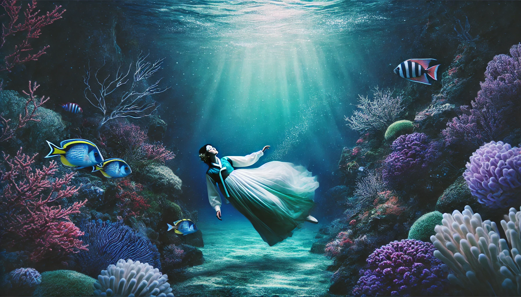 갑자기 들려온 목소리에 심청은 깜짝 놀라 주위를 살폈습니다. 그곳에는 아름다운 여인이 서 있었고, 그녀의 몸은 물고기의 비늘로 반쯤 덮여 있었습니다. 그 여인은 미소를 지으며 심청에게 손을 내밀었고, 그 손길이 심청의 팔에 닿았을 때, 이상한 따뜻함이 그녀의 온몸을 관통했습니다.