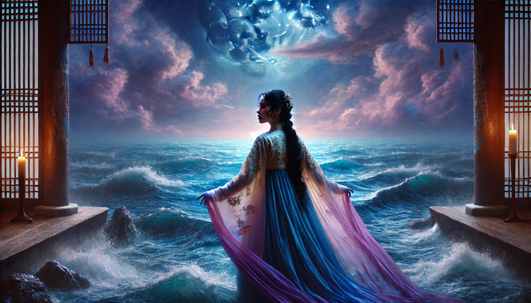 하지만 그것은 죽음이 아니라 변화의 시작이었습니다. 심청의 피부 아래에서 새로운 감각들이 깨어나기 시작했고, 그녀의 모든 세포가 새롭게 재배열되는 듯했습니다. 그녀의 머리카락은 이제 물결처럼 흘러내렸고, 그녀의 눈동자는 마치 바다의 깊이를 담은 듯 더욱 깊고 신비로워졌습니다.